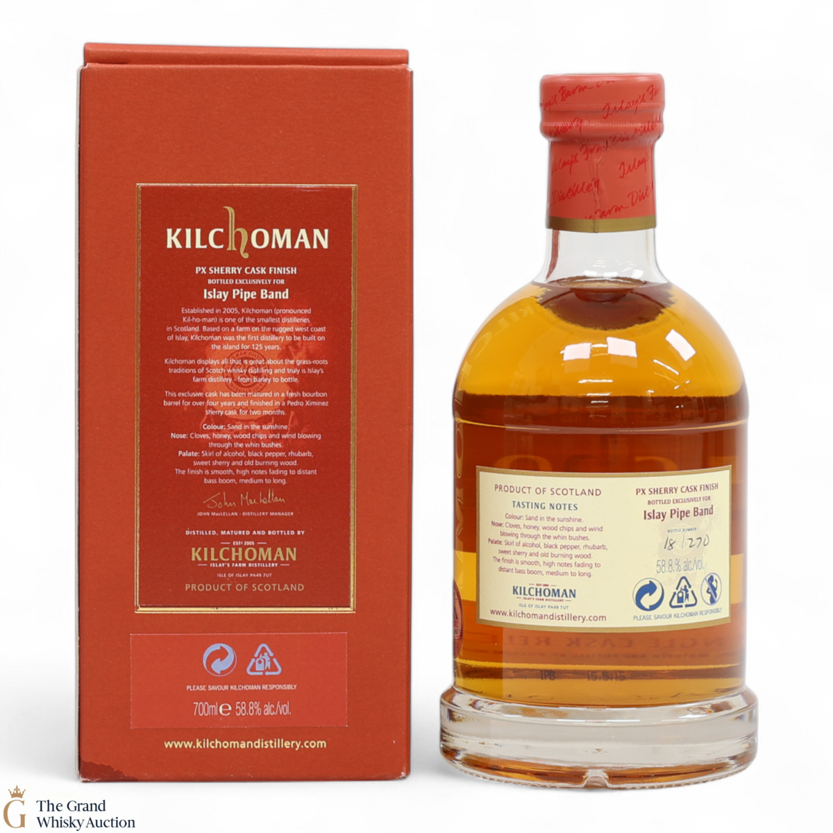 Kilchoman Distillery has sponsored the Islay Pipe Band since 2012 and this sponsorship has taken the form of a cask of whisky selected by John MacLellan, bottled and sold from the distillery with all the proceeds going to the Pipe Band.