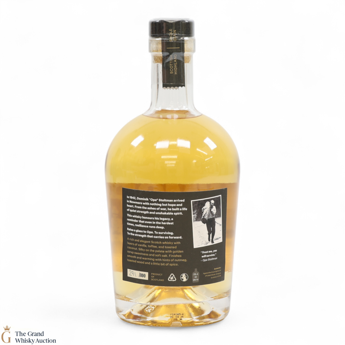 In 1942, Dominik “Opa” Stoltman arrived in Newmore with nothing but hope and heart. From the ashes of war, he built a life of quiet strength and unshakable spirit. This 20-year-old single grain whisky honours his legacy, a reminder that even in the hardest times, resilience runs deep.