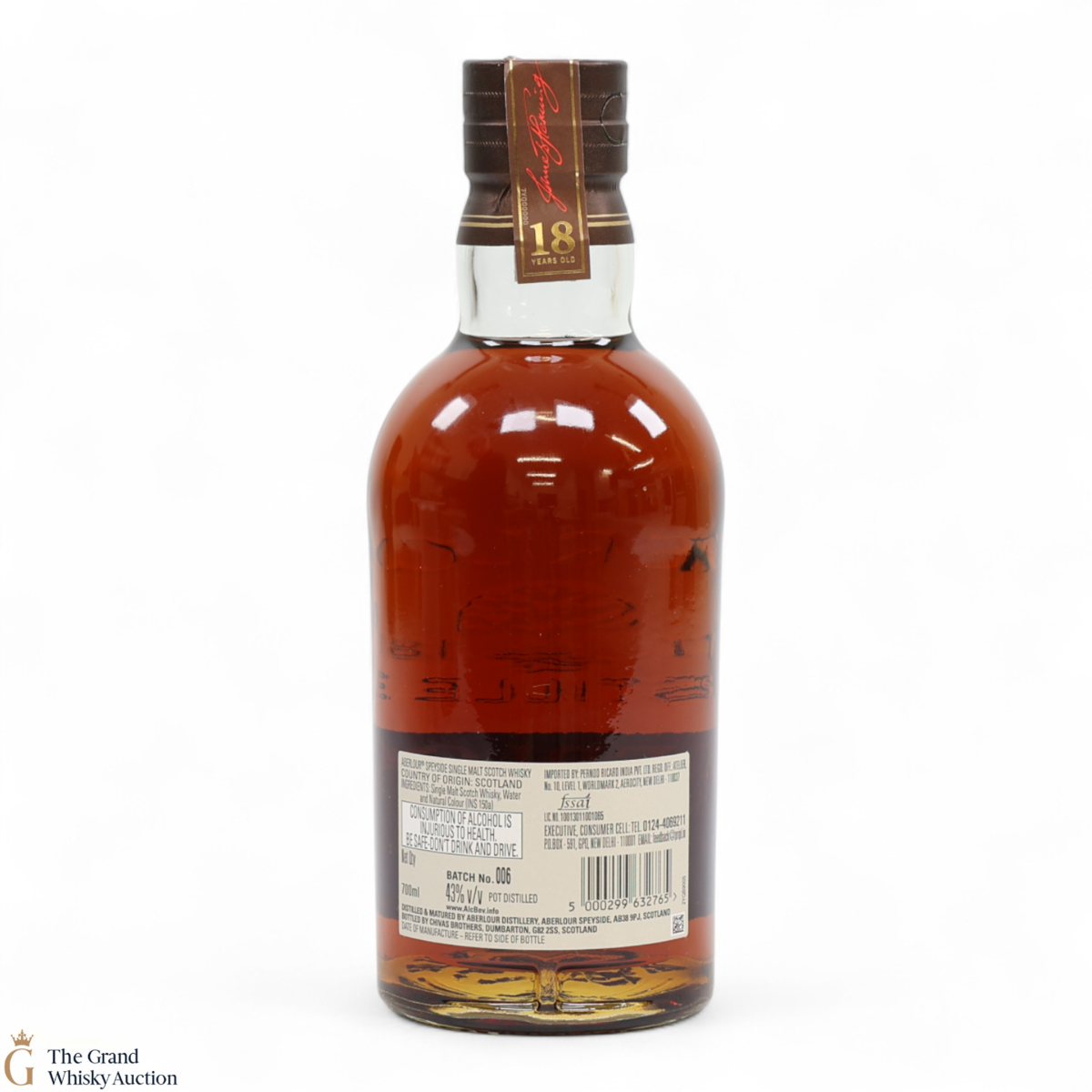Due to the various ages of bottles and their seals, the condition of liquid is at the buyer's discretion and no claim can be lodged against failure/leakage in transit. Loss and breakage cover is available at 3% of the hammer price as standard. If the lot is not insured, no claim can be lodged against the courier or The Grand Whisky Auction for breakage or loss in transit.