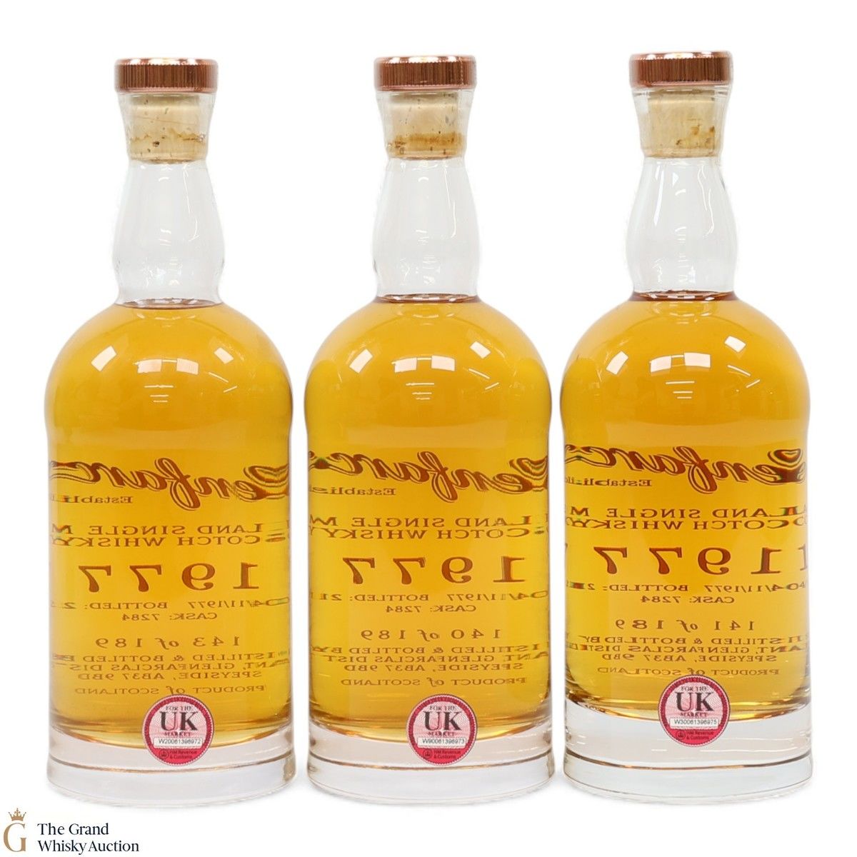 Due to the various ages of bottles and their seals, the condition of liquid is at the buyer's discretion and no claim can be lodged against failure/leakage in transit. Loss and breakage cover is available at 3% of the hammer price as standard. If the lot is not insured, no claim can be lodged against the courier or The Grand Whisky Auction for breakage or loss in transit.