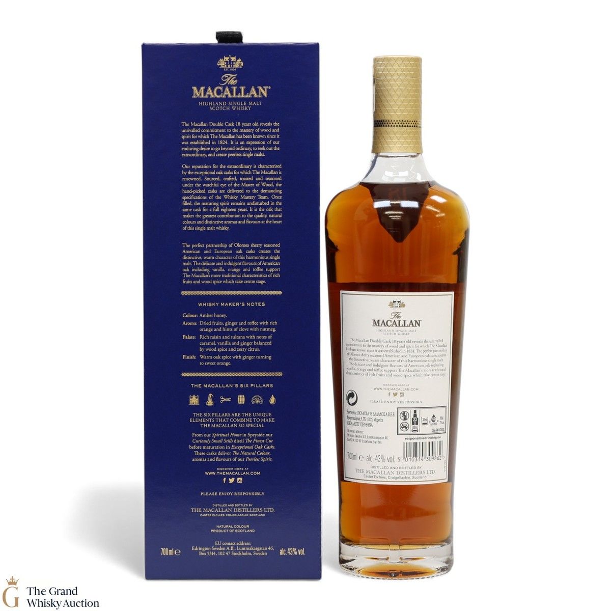 This 18-year-old Macallan was matured in a combination of American and European Sherry oak for a minimum of 18 years. It is part of the Macallan Double Cask range, which marries the classic Macallan style and the sweetness of American oak.