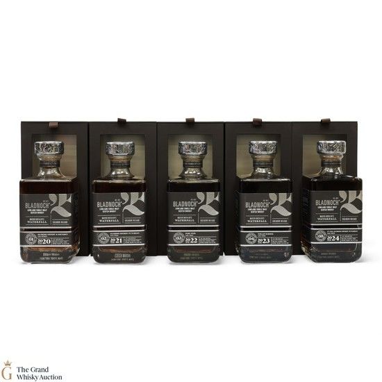 Curated by Master Distiller Dr. Nick Savage, each release was limited to only 1,000 individually numbered bottles. The collection is named for the "waterfall effect" created as the remaining whisky from one year's bottling was decanted into a new cask for further finishing for the next year's batch. Released from 2020 - 2024, this is the complete collection of the five Bladnoch Master Distiller's Waterfall batch releases.