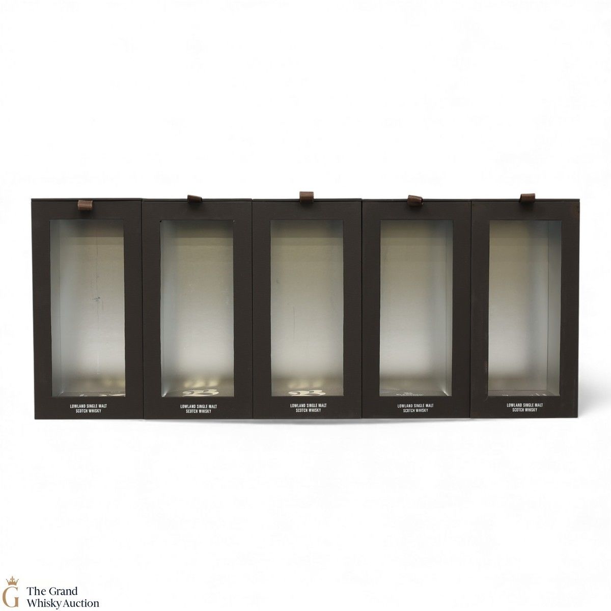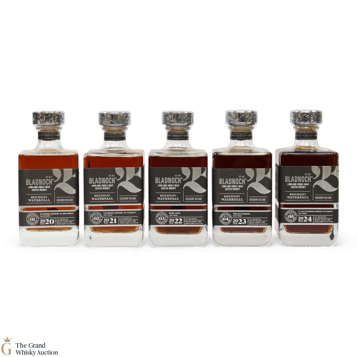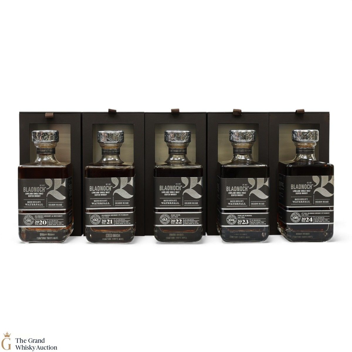 Curated by Master Distiller Dr. Nick Savage, each release was limited to only 1,000 individually numbered bottles. The collection is named for the "waterfall effect" created as the remaining whisky from one year's bottling was decanted into a new cask for further finishing for the next year's batch. Released from 2020 - 2024, this is the complete collection of the five Bladnoch Master Distiller's Waterfall batch releases.