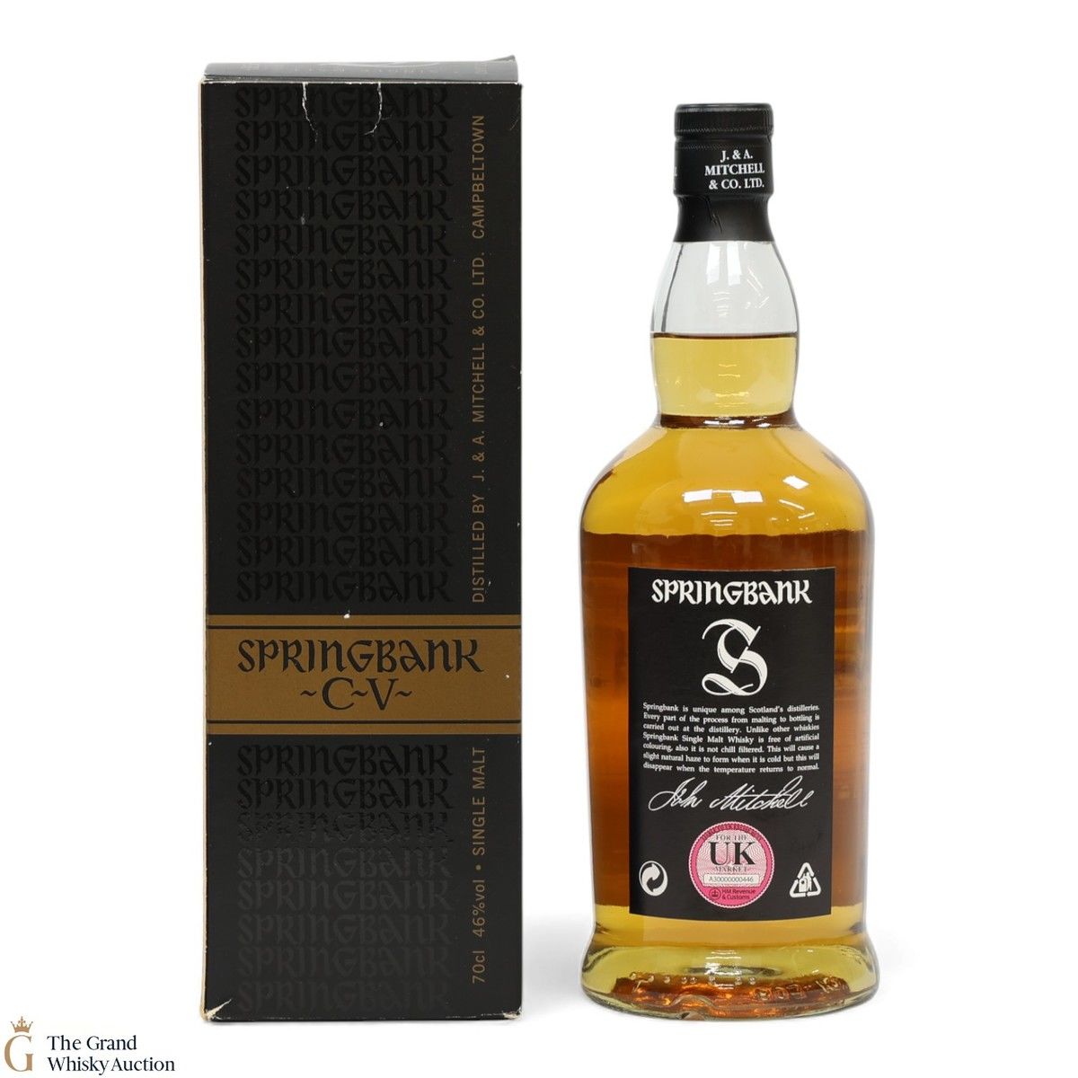 A bottle of Springbank CV which used to be Longrow's entry-level whisky. This version of Springbank is mediumly peated whisky - this is a no age statement expression. It was named Best Peated Malt at the 2010 Malt Maniacs Awards.