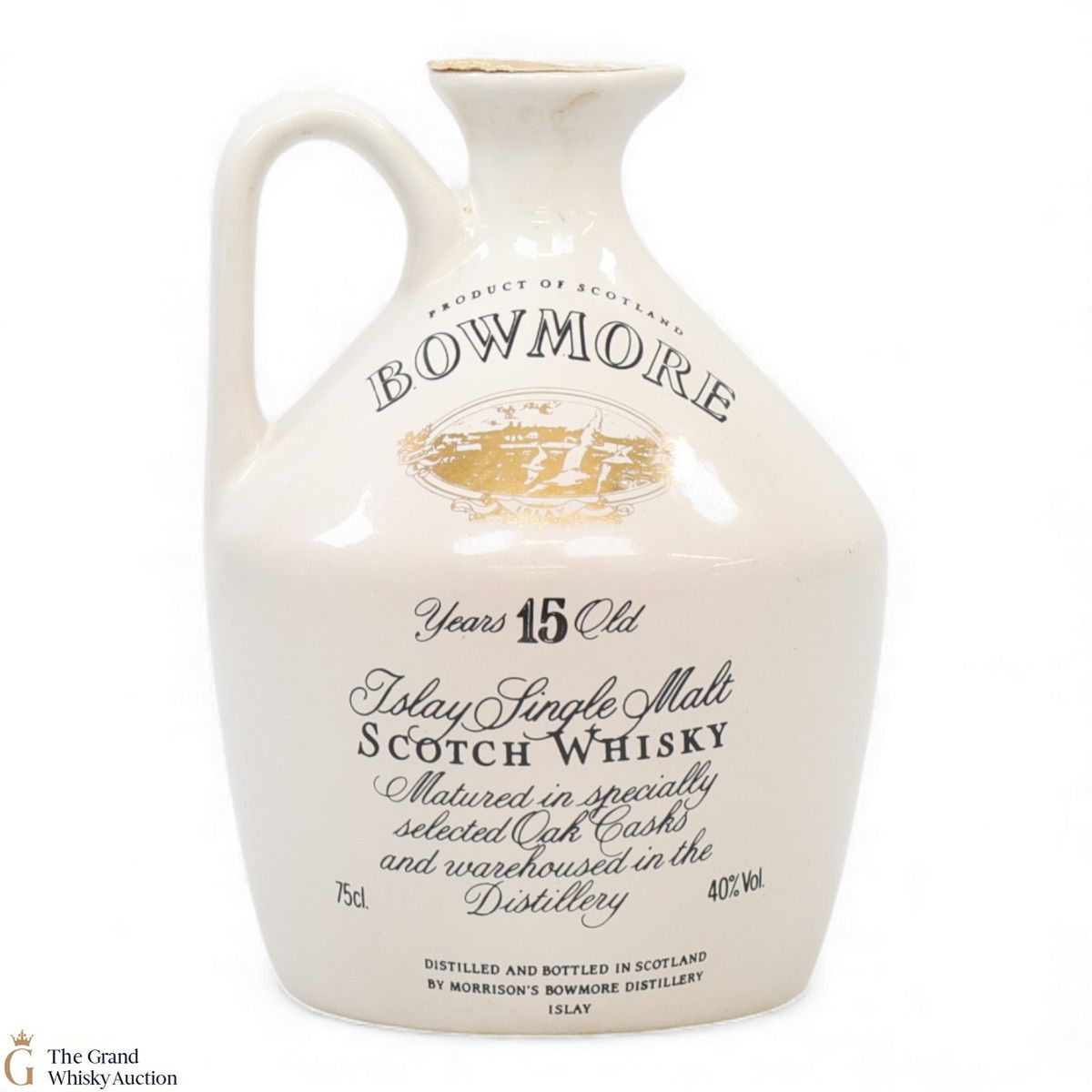This striking older-style presentation of Bowmore 15 Year Old single malt from the now highly sought decanter bottlings.
