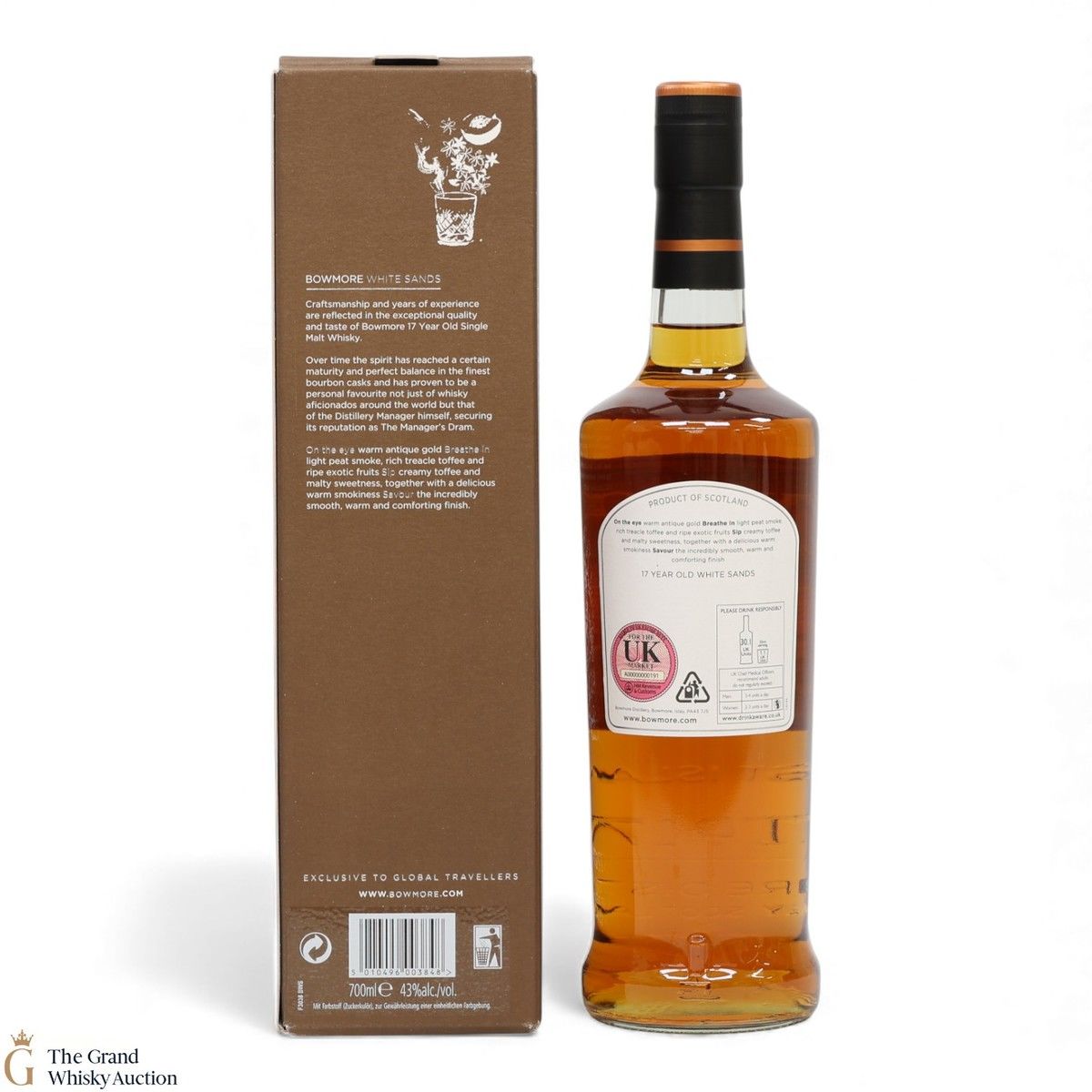 Due to the various ages of bottles and their seals, the condition of liquid is at the buyer's discretion and no claim can be lodged against failure/leakage in transit. Loss and breakage cover is available at 3% of the hammer price as standard. If the lot is not insured, no claim can be lodged against the courier or The Grand Whisky Auction for breakage or loss in transit.