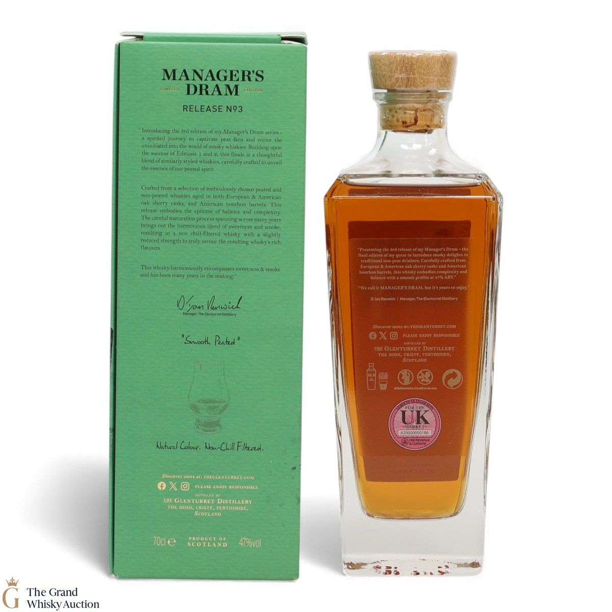 The Glenturret Manager's Dram - Release 3 is described as smooth peated and matured in Ex-Bourbon & Sherry casks before being bottled in 2023.