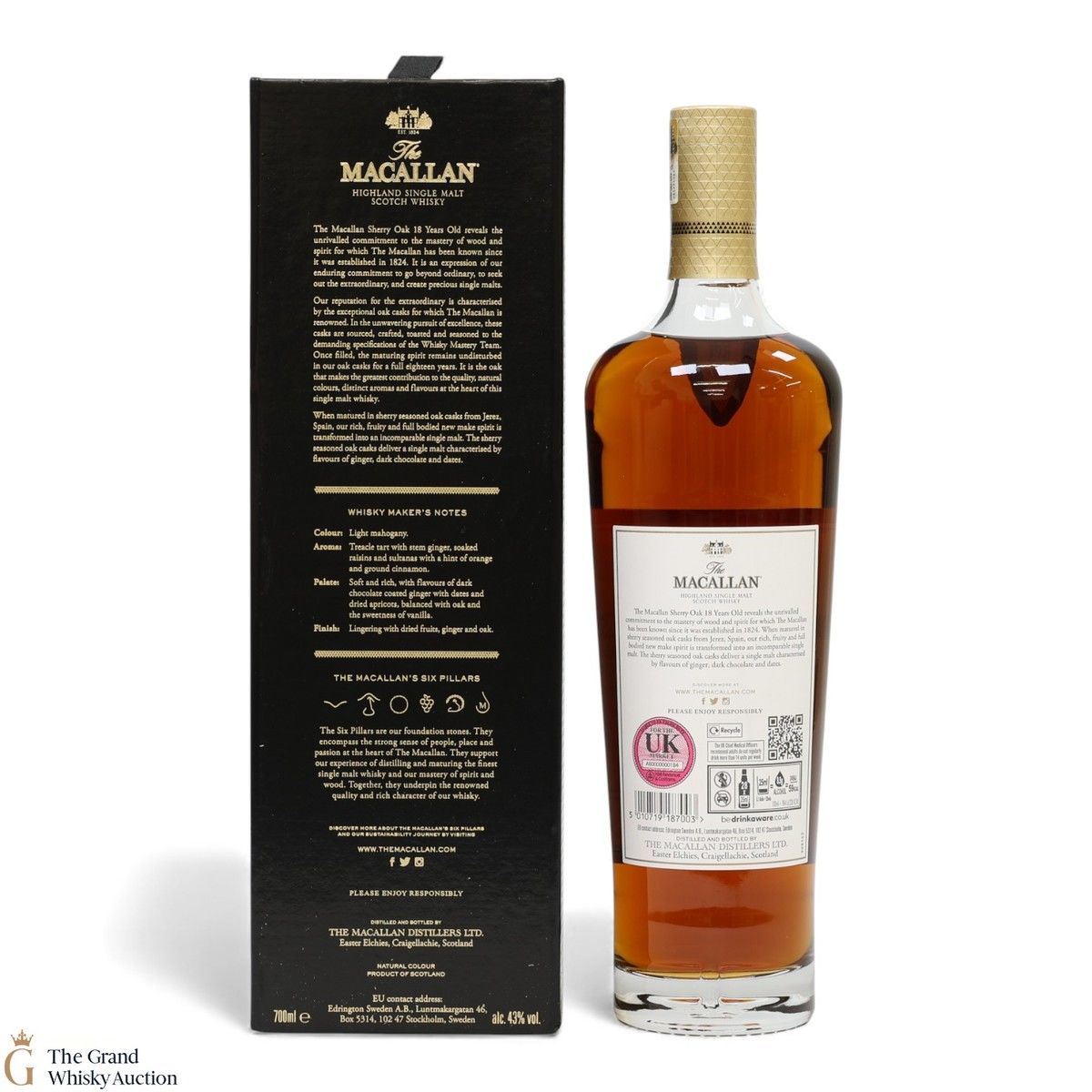 This annual release of The Macallan's popular 18-year-old Sherry Oak is matured exclusively in sherry-seasoned casks, built from both Spanish and American oak, providing a beautifully dark flavour with rich aromas.