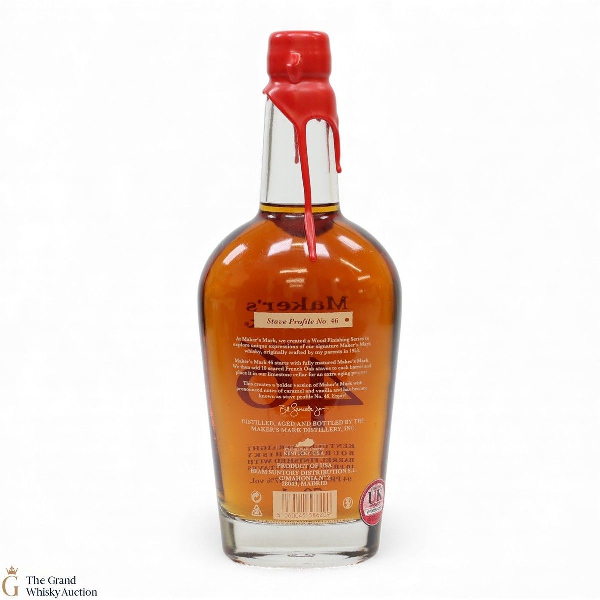 The first bourbon in the Makers Mark wood-finishing series. Maker's Mark 46 was created by Bill Samuels, Jr., to amplify the flavours he loves in Maker's Mark. The innovative wood-stave-finishing process starts with a fully matured Maker's Mark at cask strength. Then 10 seared virgin French oak staves are inserted into the barrel and finished for nine weeks in a limestone cellar.