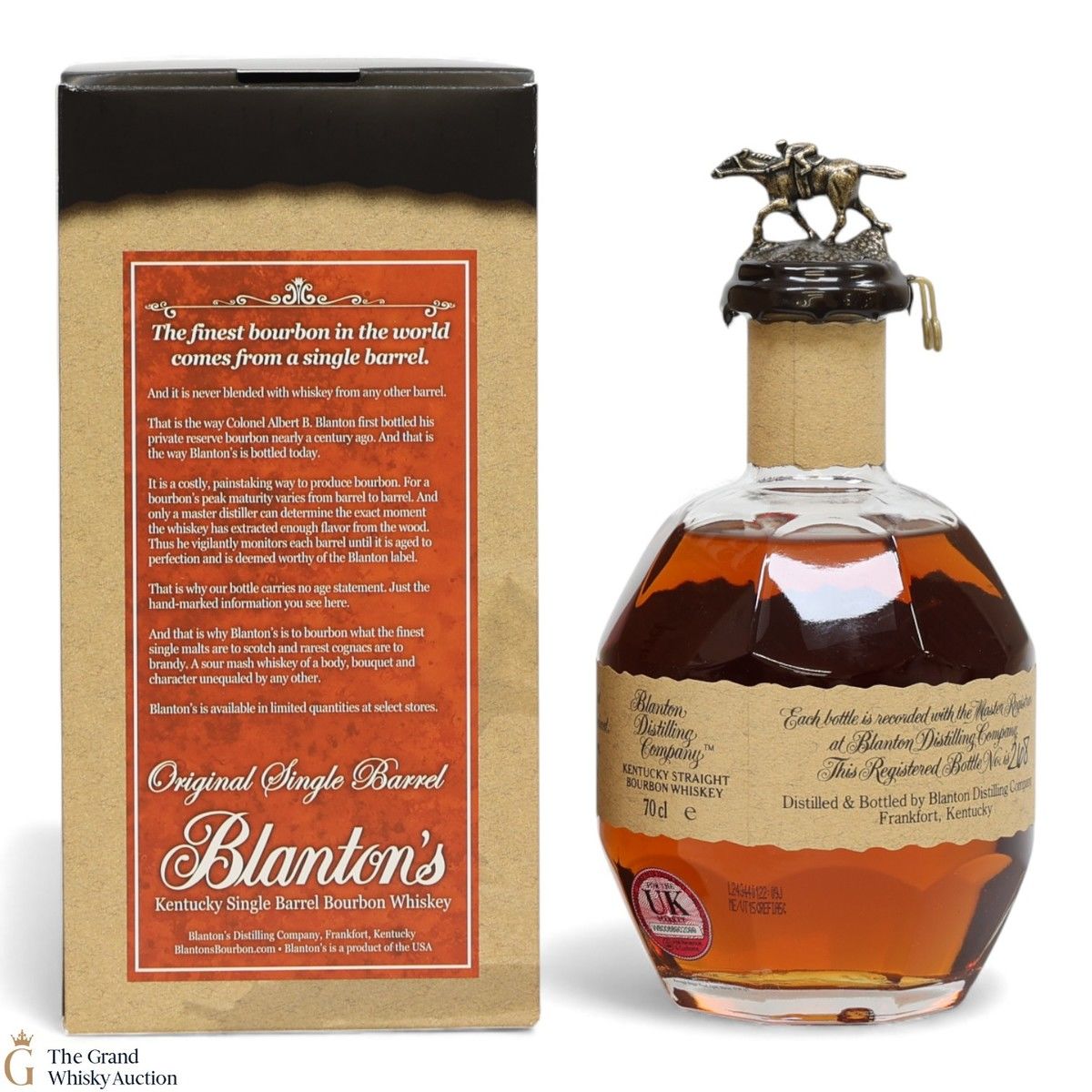 PLEASE NOTE: The wax seal on Blanton's bottles are prone to cracking in transit due to their design. Therefore, as stated in our T&C’s, we do not and will not accept liability should the seal be breached, broken, split or leak in transit. Additionally, please know due to the design of the internal cardboard packaging that surrounds the top of the bottles, it too may be torn. By bidding on this lot you have understood this to be true. Insurance is for complete breakage or loss in transit only.