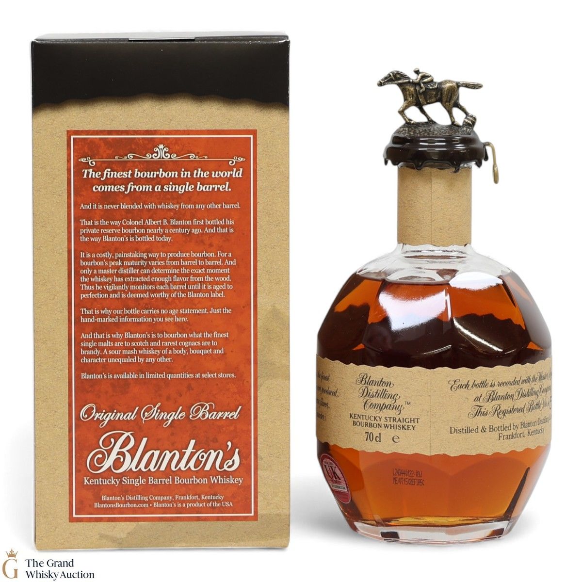 PLEASE NOTE: The wax seal on Blanton's bottles are prone to cracking in transit due to their design. Therefore, as stated in our T&C’s, we do not and will not accept liability should the seal be breached, broken, split or leak in transit. Additionally, please know due to the design of the internal cardboard packaging that surrounds the top of the bottles, it too may be torn. By bidding on this lot you have understood this to be true. Insurance is for complete breakage or loss in transit only.