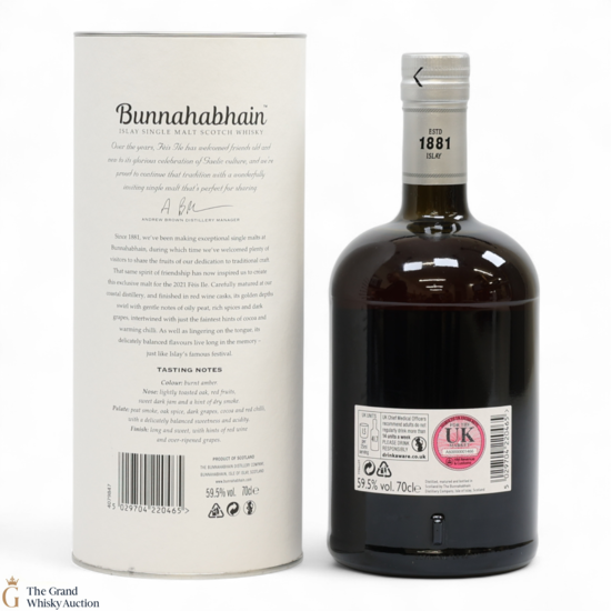 Bunnahabhain's first release for Feis Ile 2021 is this limited-edition smoky whisky. Distilled on the 10th of October 2013, this single malt was finished in Moine Bordeaux casks which gives the Bunnahabhain a delicately balanced flavour. Bottled on the 25th of November 2020, this is one of only 5166 bottles produced.