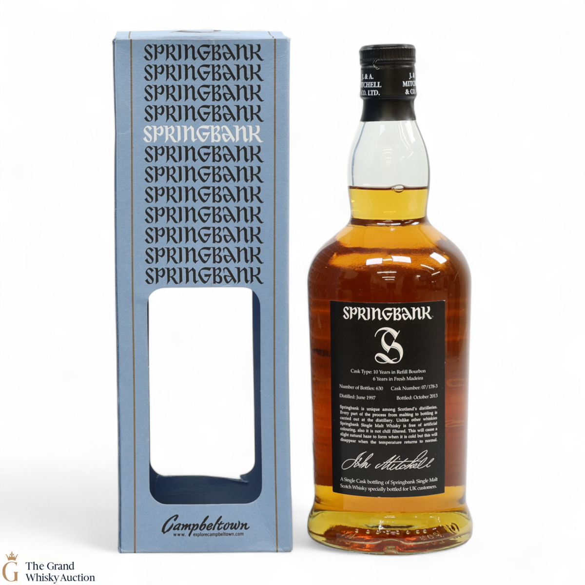 A 1997 single cask Springbank matured in a single refill bourbon cask for 10 years then transferred into a fresh Madeira cask for another six years. Bottled in October 2013 from cask number 07/178-3 at the cask strength of 54%. This is one of 630 bottles. A UK exclusive bottling.