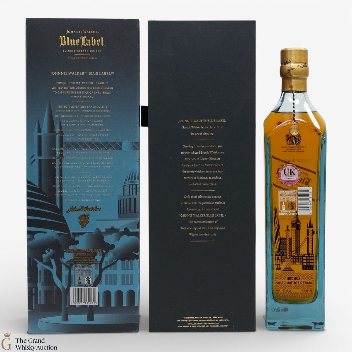 A limited-edition bottling of Johnnie Walker Blue Label with a cityscape of London on the bottle label and box. The design features the Gherkin, Nelson's Column, Tower Bridge and Elizabeth Tower.
