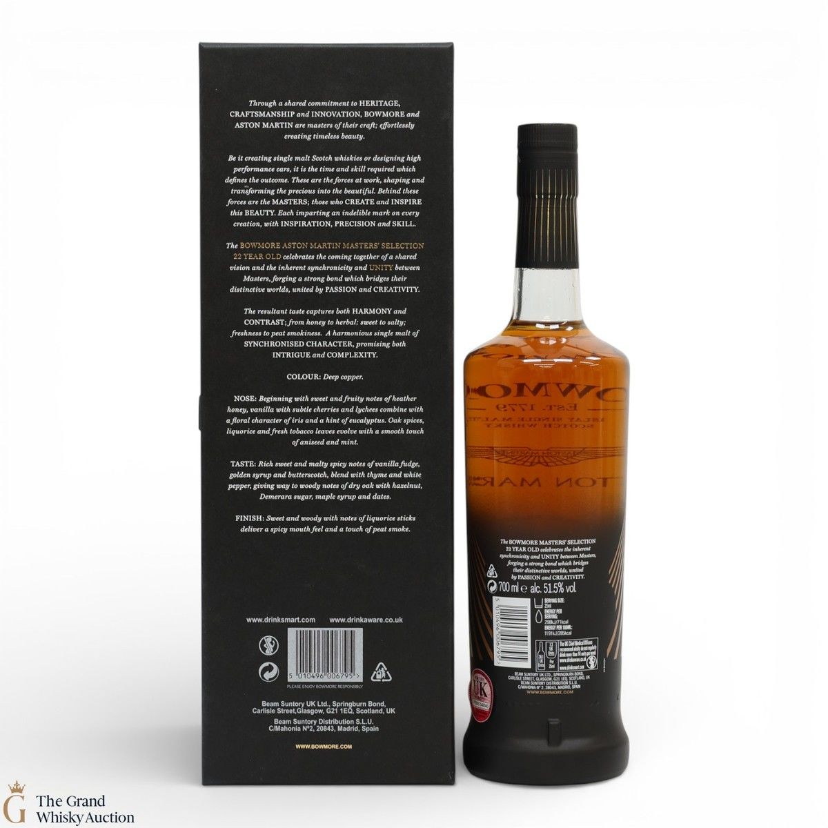 This 22-Year-Old Bowmore is a limited-edition single malt created in collaboration between Ron Welsh, Bowmore Master Blender, and Marek Reichman, Aston Martin Chief Creative Officer. Matured in a combination of American oak hogsheads and sherry butts. The result is a single malt that thrills all the senses for optimal enjoyment.