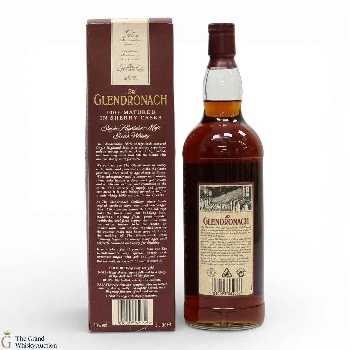 A 1L bottle of Glendronach 15 Year Old from the 1990s. Matured sherry casks. At the time of release, this expression was a flagship whisky for Glendronach. It has since been followed by the new and very popular 15-Year-Old Revival.