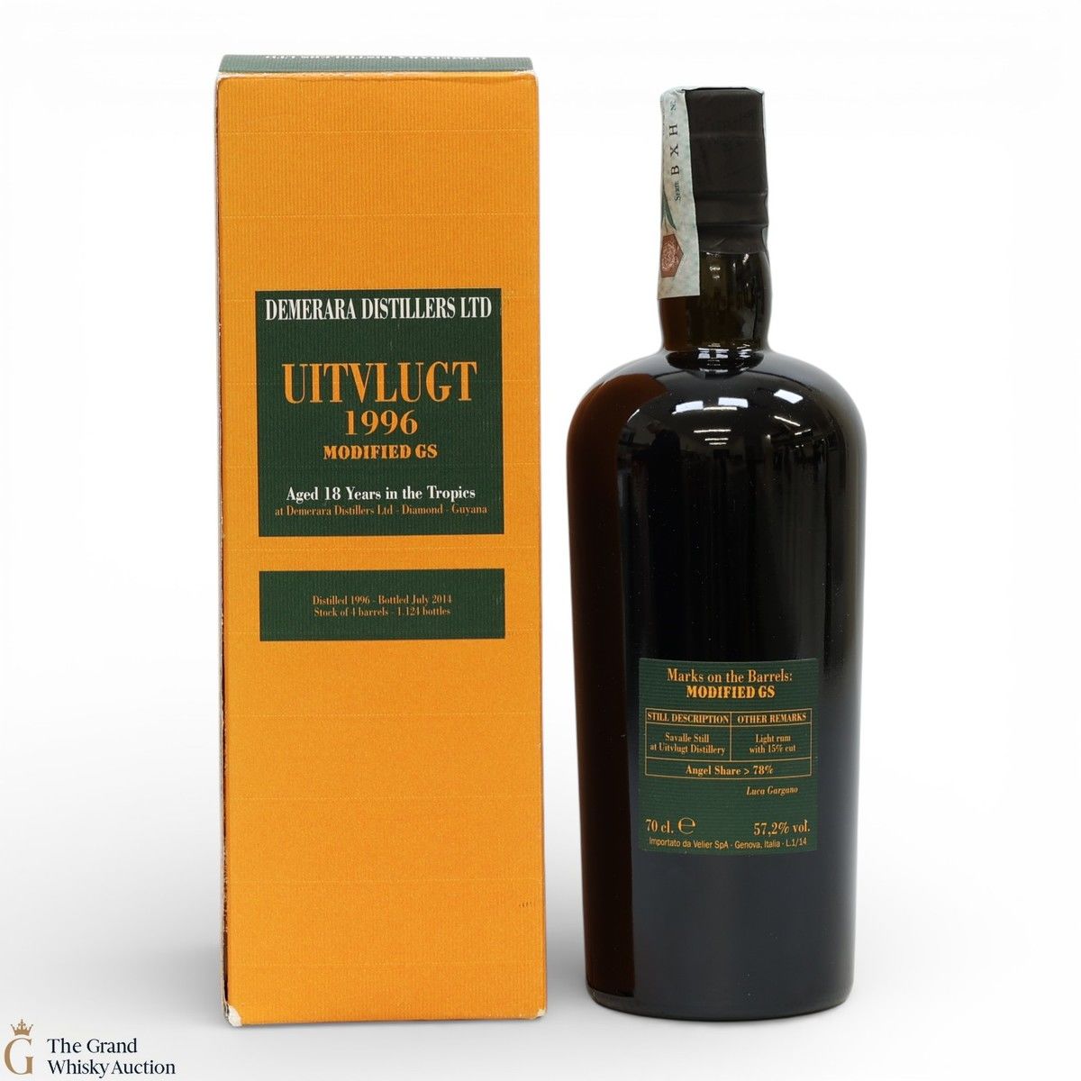 This rum was bonded at Uitvlugt in 1996, tropically aged and bottled in July 2014 from four barrels. The GS cask marque indicates that this rum was produced in the four-column Savalle still.