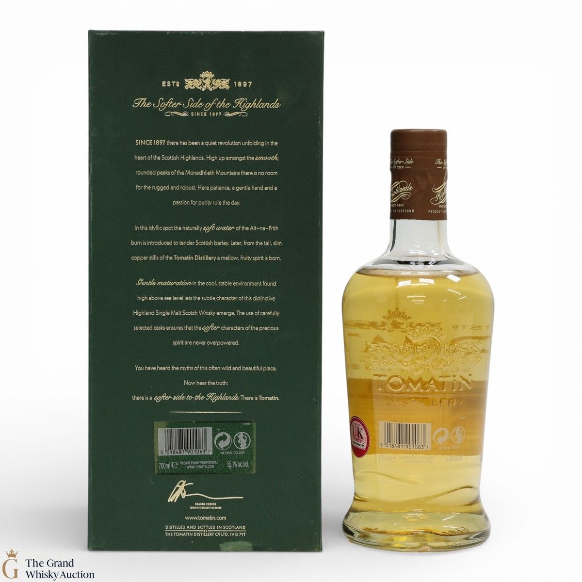Tomatin Distillery was founded in 1897 by the Tomatin Spey Distillery Company, located in the Highlands between Aviemore and Inverness. Going through various fluctuations in production whilst growing from 2 stills to 23 stills throughout the 60s and 70s before going into liquidation. In 1985 the Distillery was purchased by long-term Japanese customers, Takara Shuzo Co. and Okara & Co. thus becoming the first Scottish distillery to be under Japanese management. Later the prestigious Antiquary blender J&W Hardie was added to the portfolio, and Marubeni bought the distillery. In more recent years production has been downsized to utilise just 10 stills and the decision was made to focus on the single malt range, such as the ‘Cu Bocan’ expression released in 2013.
