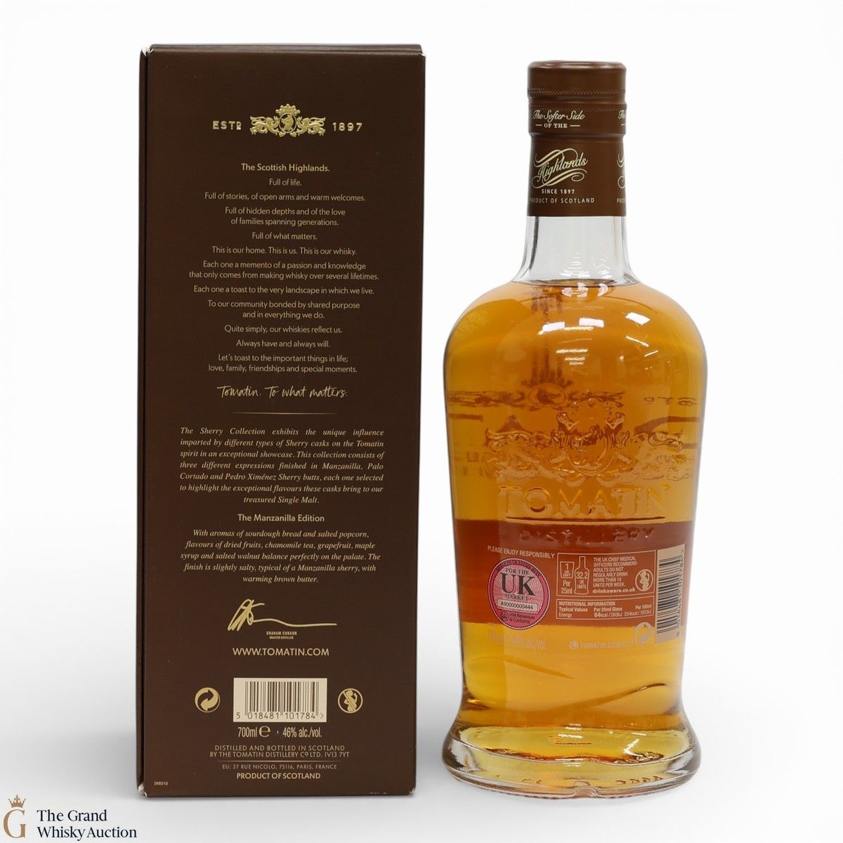 One of a trio of single malts released for Tomatin's Sherry Collection in 2024, this 2014 vintage single malt Scotch whisky was aged for a decade, including a finish in Manzanilla sherry casks for two years. It was bottled at 46% ABV, non-chill filtered and with natural colour.