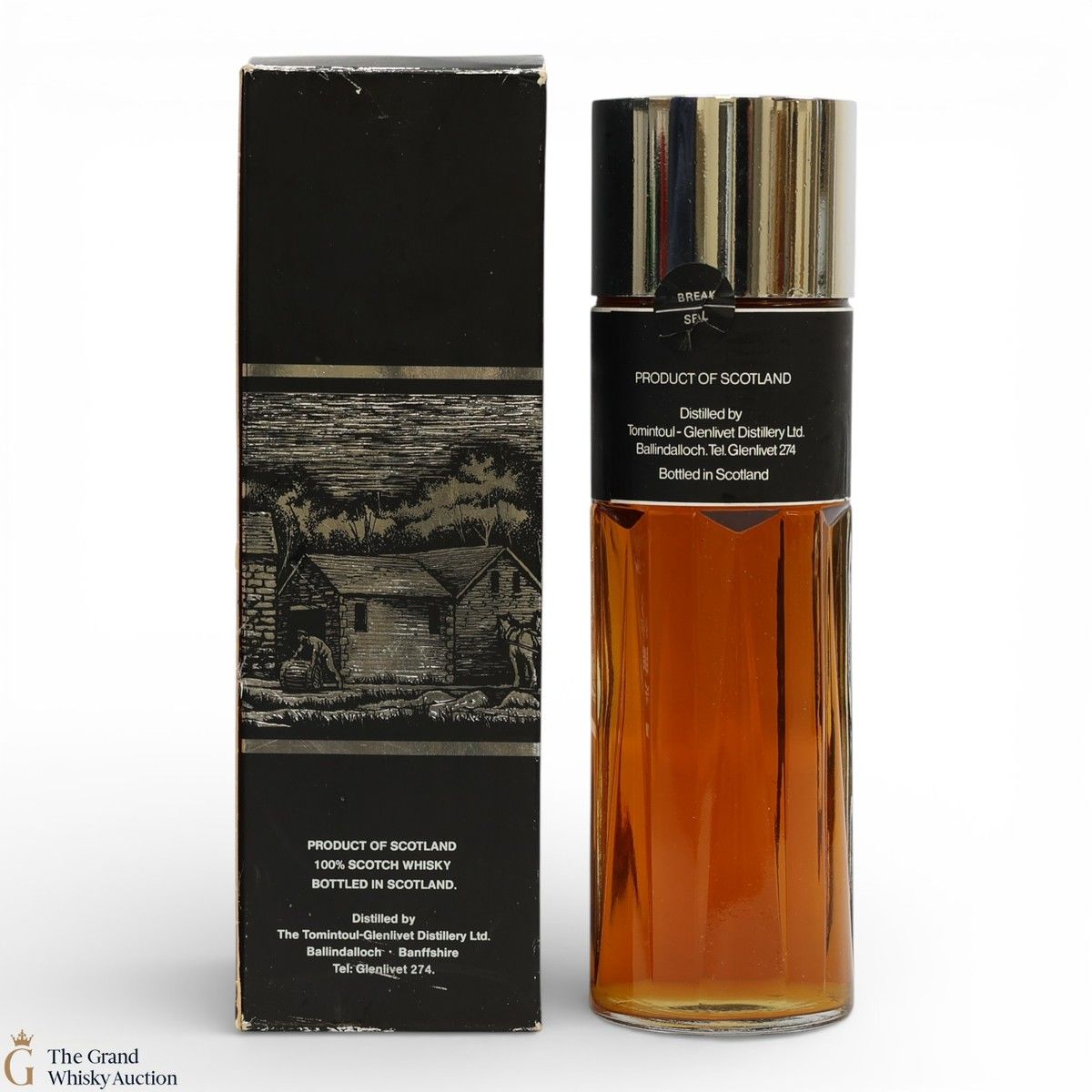 This 1970s bottle from the Tomintoul (Glenlivet) distillery is an unusual shape. It features a round, grooved/fluted glass and a large silver screwtop - often referred to as a perfume bottle style. Very different from the traditional bottleneck.