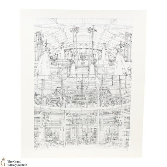 'Stillhouse I', a pen and ink drawing by Anja Kempa of Roger Stirk Harbour + Partners. The impressive drawing illustrates the intricacies of The Macallan Distillery.
