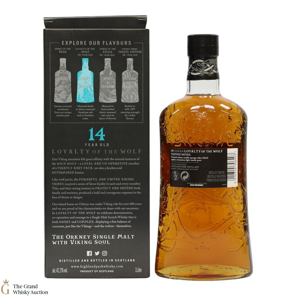 The 'Loyalty of the Wolf' by Highland Park is a 14-year-old single malt. This is a 1L bottle.