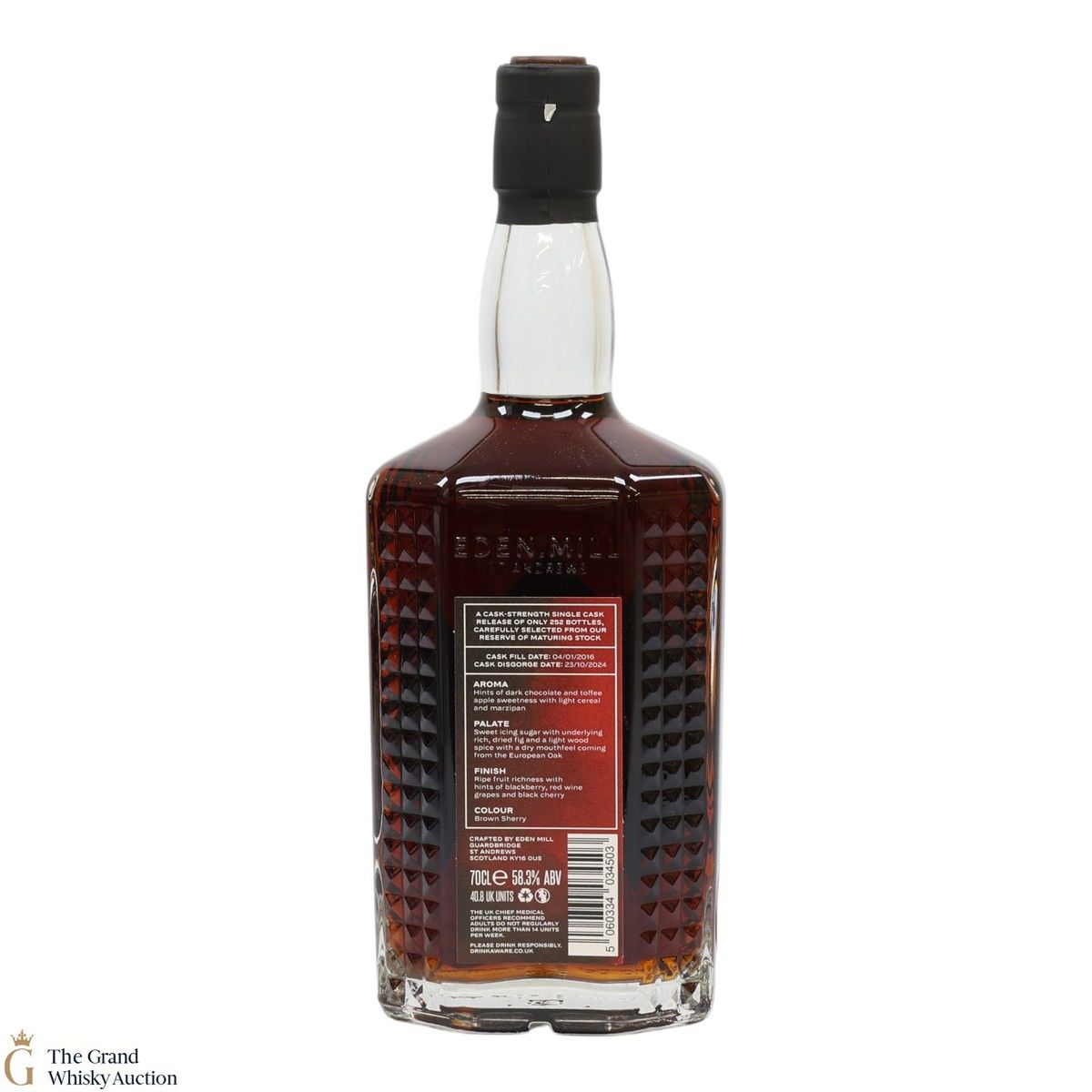 Eden Mill's 2024 release single malt has been entirely matured in a Pedro Ximénez cask. This cask was filled on January 4, 2016, and disgorged on October 23rd, 2024, with an outturn of 252 bottles at cask strength of 58.3% ABV.