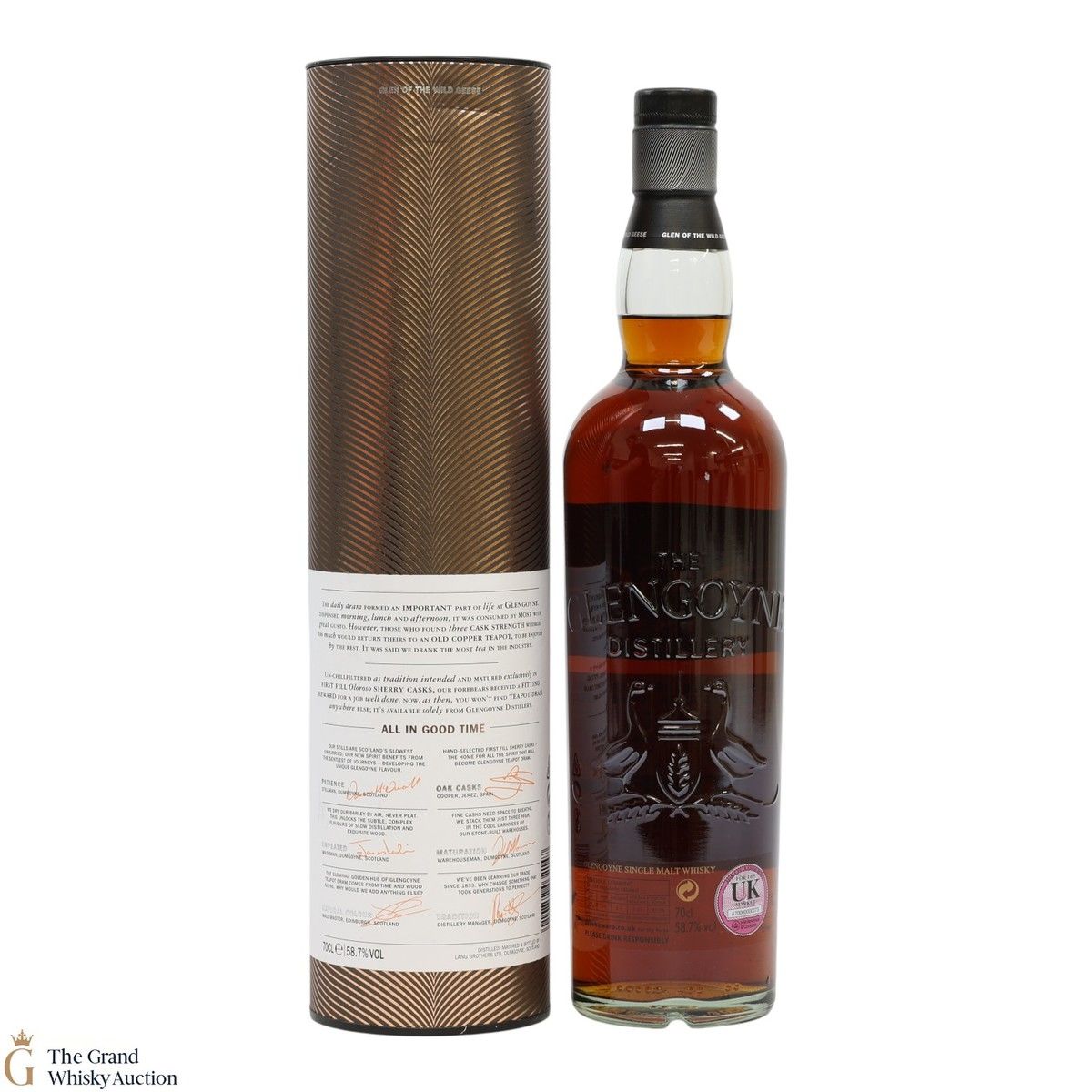 Due to the various ages of bottles and their seals, the condition of liquid is at the buyer's discretion and no claim can be lodged against failure/leakage in transit. Loss and breakage cover is available at 3% of the hammer price as standard. If the lot is not insured, no claim can be lodged against the courier or The Grand Whisky Auction for breakage or loss in transit.