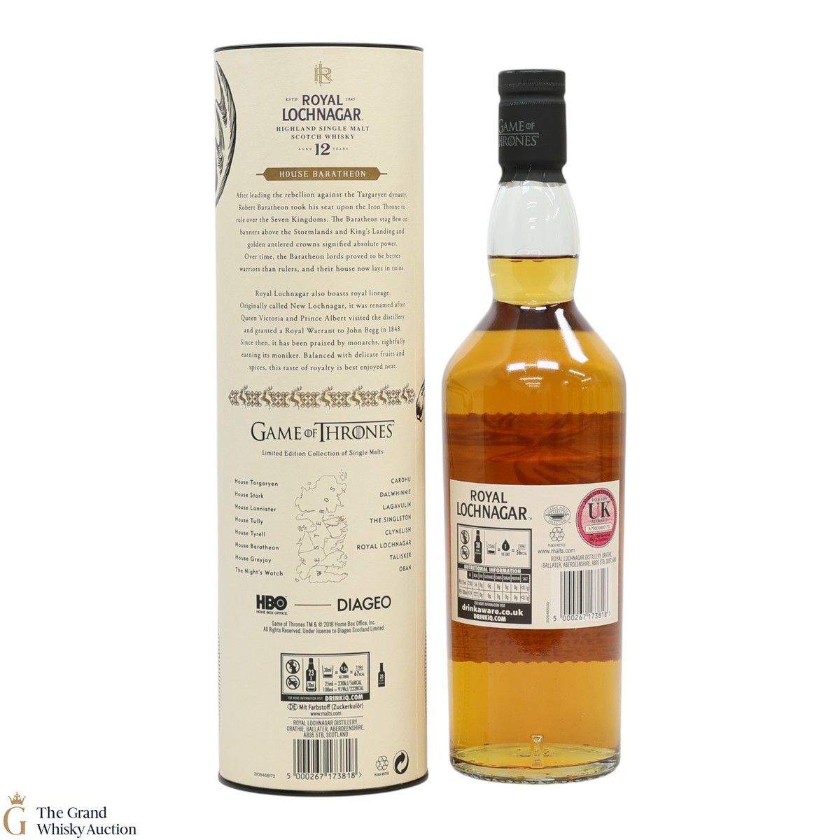 This is a limited-edition 12 year old single malt from Royal Lochnagar and it is part of Diagio's 2018 collaboration with HBO. Each single malt in the series relates to the land of houses of the Game of Thrones television series. The Royal Lochnagar bottle is decorated with a rampant black Stag, the sigil of House Baratheon that once flew on banners above the Stormlands and King’s Landing signifying absolute power.