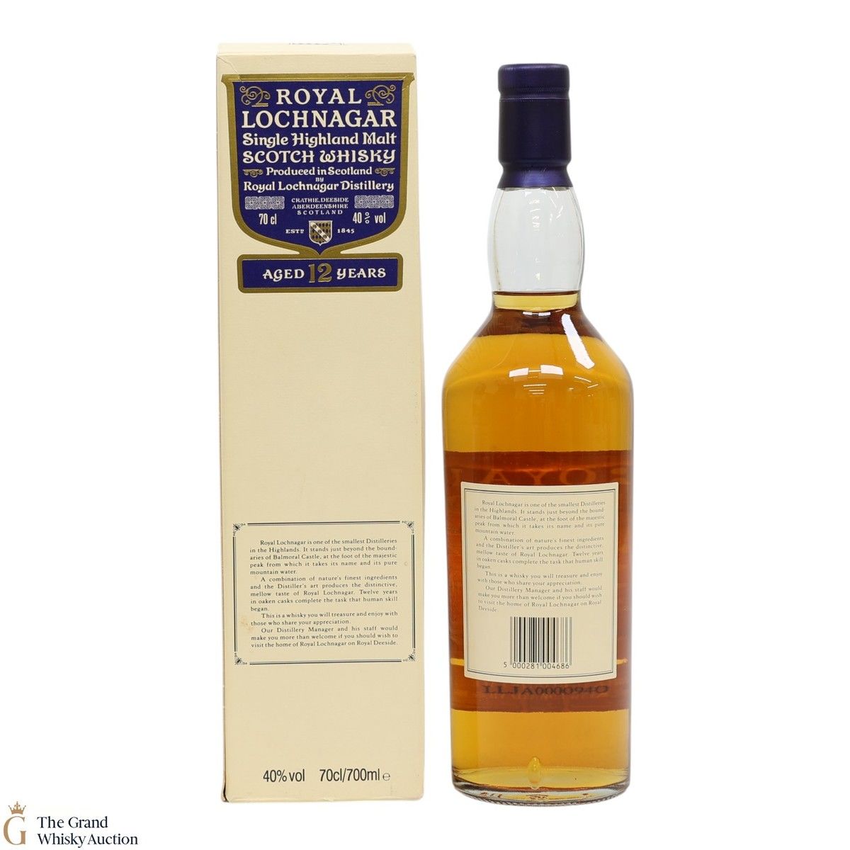 Due to the various ages of bottles and their seals, the condition of liquid is at the buyer's discretion and no claim can be lodged against failure/leakage in transit. Loss and breakage cover is available at 3% of the hammer price as standard. If the lot is not insured, no claim can be lodged against the courier or The Grand Whisky Auction for breakage or loss in transit.