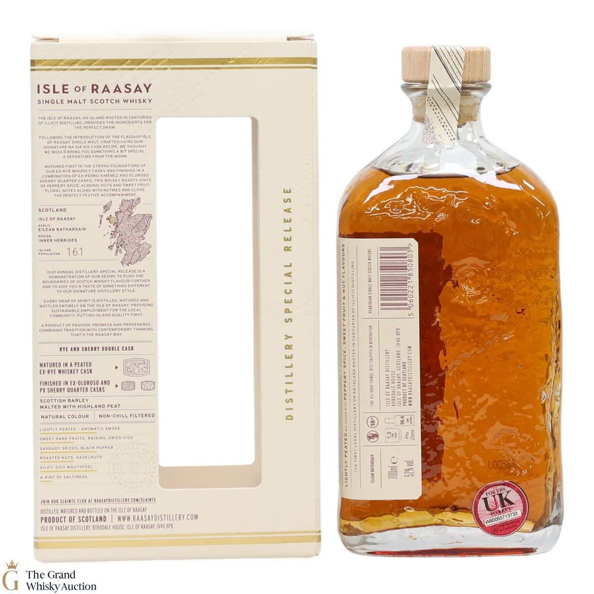 Matured first in ex-rye whiskey casks and finished in a combination of ex-Pedro Ximénez and Oloroso sherry quarter casks, this whisky boasts hints of peppery spice, almond, nuts and sweet fruit. It is a Raasay Distillery special release, bottled at 52%.