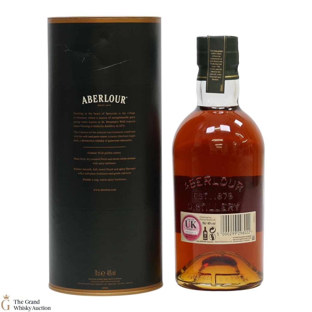 Due to the various ages of bottles and their seals, the condition of liquid is at the buyer's discretion and no claim can be lodged against failure/leakage in transit. Loss and breakage cover is available at 3% of the hammer price as standard. If the lot is not insured, no claim can be lodged against the courier or The Grand Whisky Auction for breakage or loss in transit.