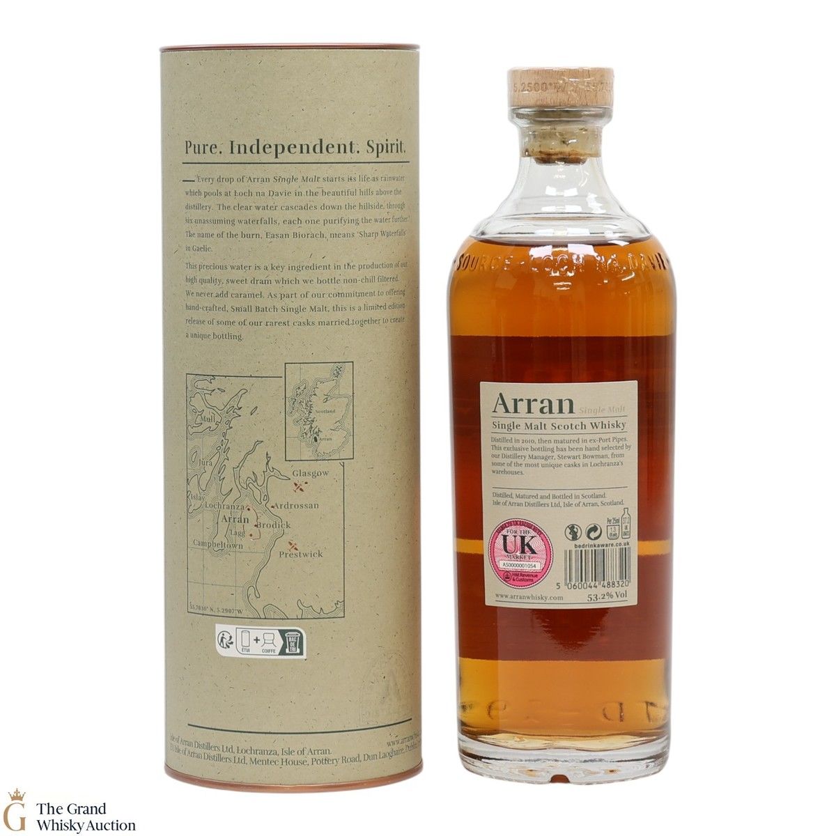 This Arran small batch release was matured for 13 years in port cask wood. Selected and bottled exclusively for the UK, this small batch Single Malt is non-chill filtered and natural in colour and bottled at a strength 53.2% ABV.