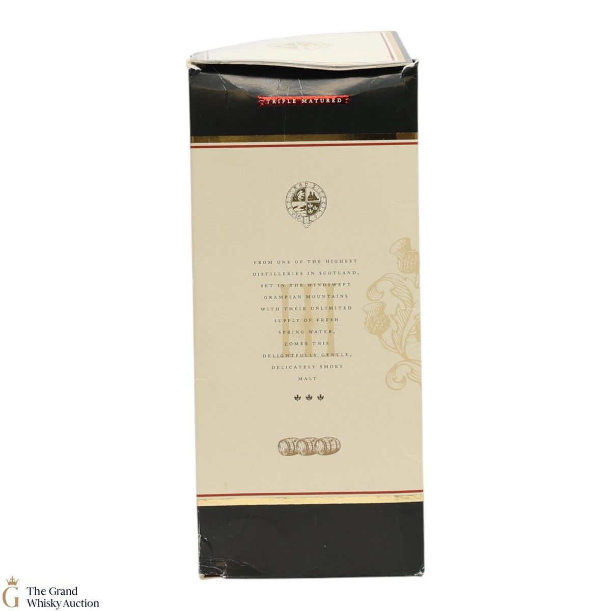 Due to the various ages of bottles and their seals, the condition of liquid is at the buyer's discretion and no claim can be lodged against failure/leakage in transit. Loss and breakage cover is available at 3% of the hammer price as standard. If the lot is not insured, no claim can be lodged against the courier or The Grand Whisky Auction for breakage or loss in transit.