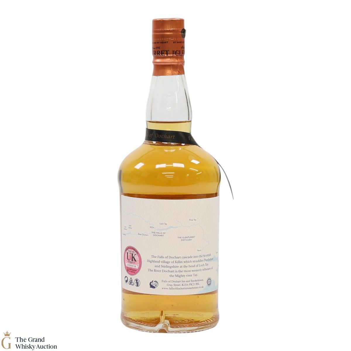 A bottle of limited edition Glenturret single malt whisky produced in small batches and matured for 10 years. This peated edition has been specially produced for the Falls of Dochart Inn & Smokehouse.