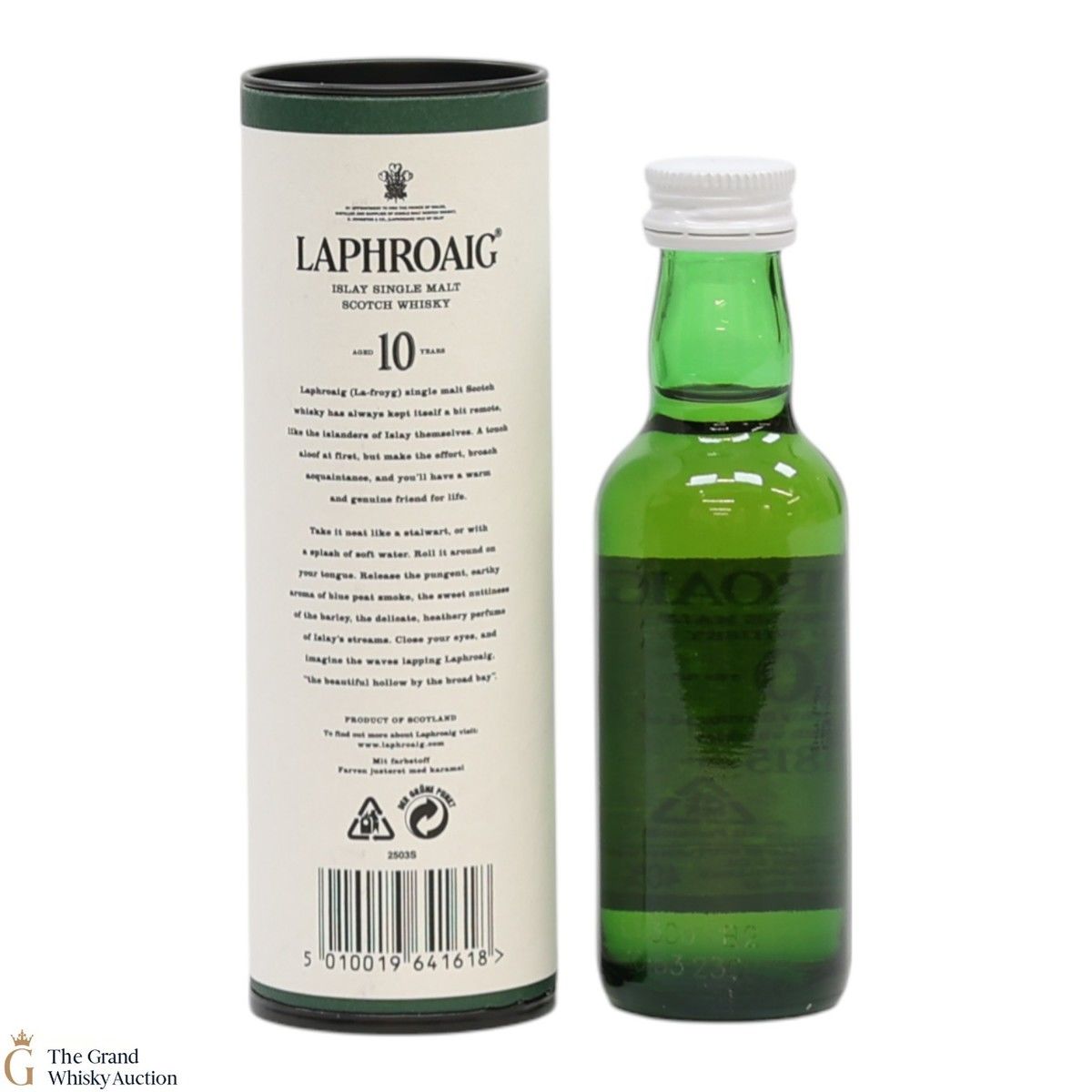 A 5cl of the medicinal 10 year old from Islay's bestselling distillery, Laphroaig. In making Laphroaig, malted barley is dried over a peat fire. The smoke from this peat, found only on Islay, gives Laphroaig its particularly rich flavour.