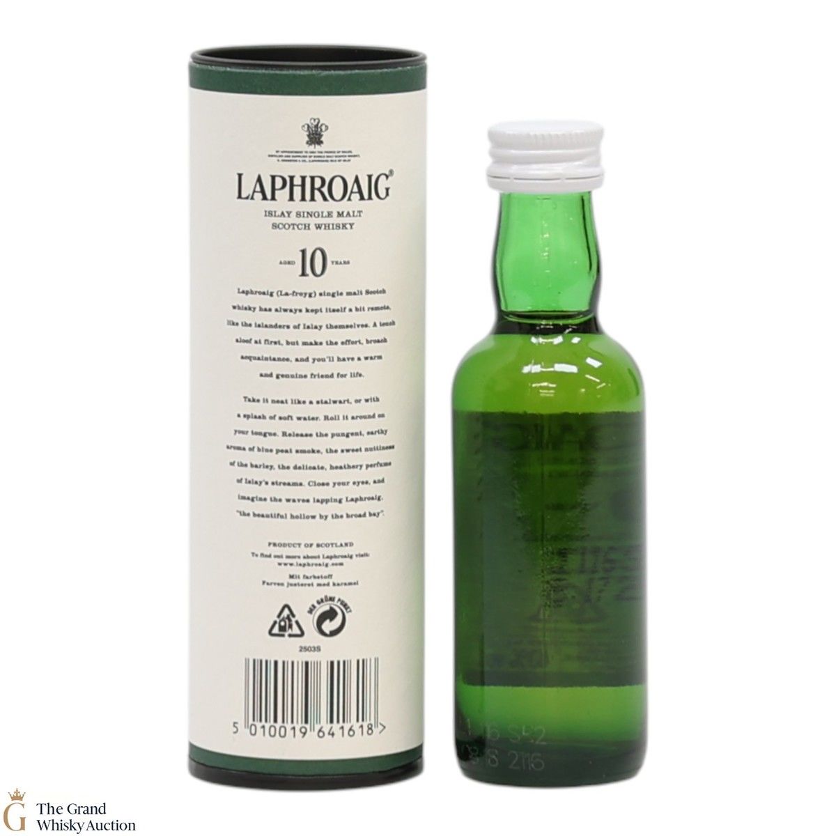 A 5cl of the medicinal 10 year old from Islay's bestselling distillery, Laphroaig. In making Laphroaig, malted barley is dried over a peat fire. The smoke from this peat, found only on Islay, gives Laphroaig its particularly rich flavour.