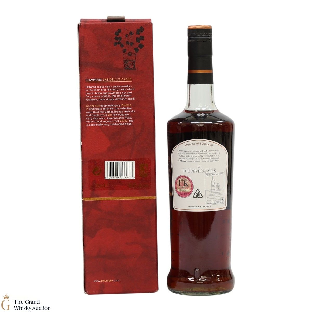 This is Bowmore's first release of The Devil's Cask, a spellbinding potion of rich fruitcake, tarry chocolate and deliciously dark fruits. Aged for 10 years in first-fill sherry casks. This was bottled at a strength of 56.9% ABV and release as a small batch of around 6,000 bottles.