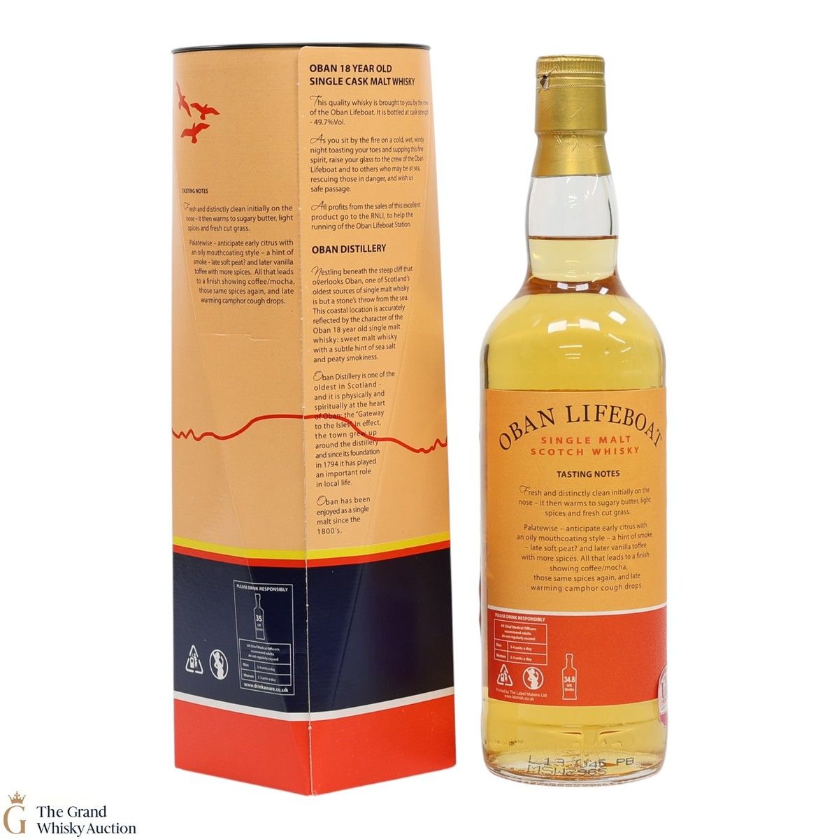 This is an 18-year-old Oban single cask malt whisky bottled by Douglas Laing. Bottled and released celebration of its 40th anniversary of Oban Lifeboat. station and to raise money.
