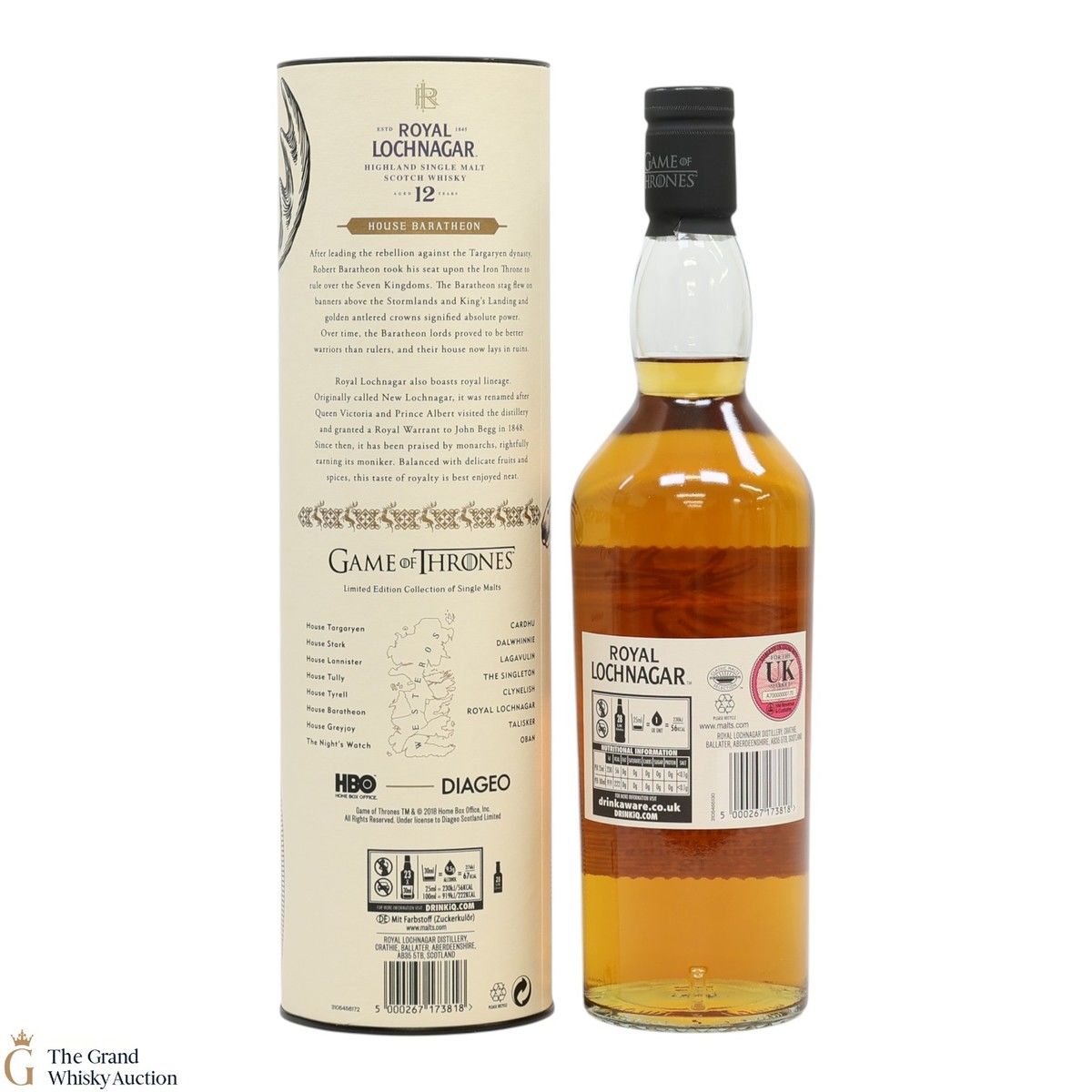 This is a limited-edition 12 year old single malt from Royal Lochnagar and it is part of Diagio's 2018 collaboration with HBO. Each single malt in the series relates to the land of houses of the Game of Thrones television series. The Royal Lochnagar bottle is decorated with a rampant black Stag, the sigil of House Baratheon that once flew on banners above the Stormlands and King’s Landing signifying absolute power.