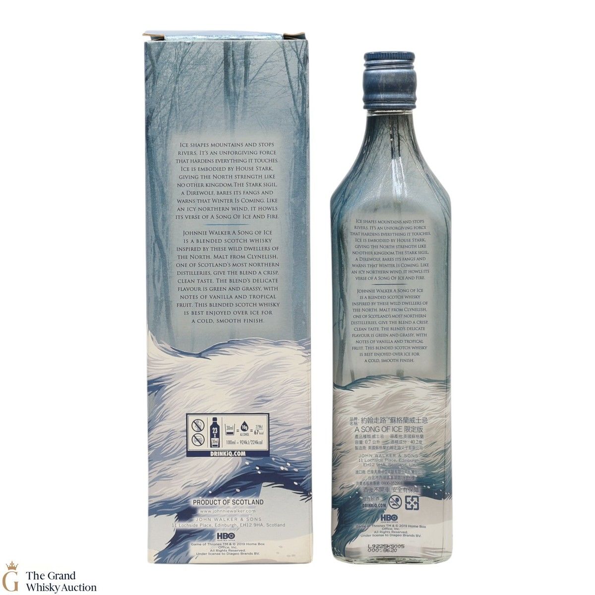 A Song of Ice is a blended Scotch inspired by the Direwolves used as the sigil for the House of Stark. With a good proportion of malt from Clynelish, a northern Scotland distillery and a wintery bottle design it warns that 'winter is coming'