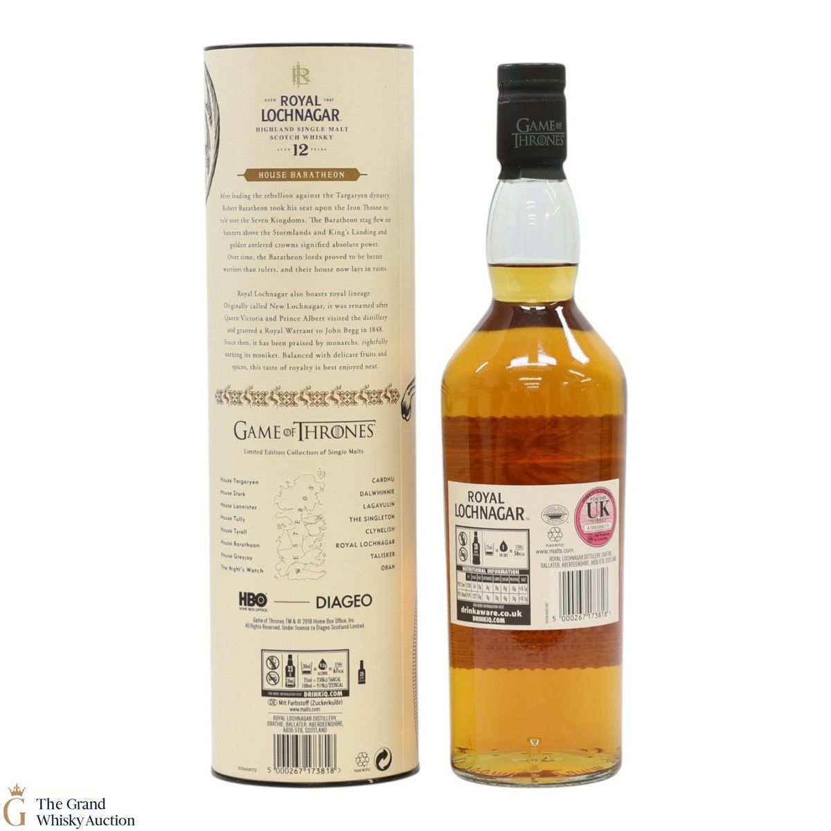 This is a limited-edition 12 year old single malt from Royal Lochnagar and it is part of Diagio's 2018 collaboration with HBO. Each single malt in the series relates to the land of houses of the Game of Thrones television series. The Royal Lochnagar bottle is decorated with a rampant black Stag, the sigil of House Baratheon that once flew on banners above the Stormlands and King’s Landing signifying absolute power.