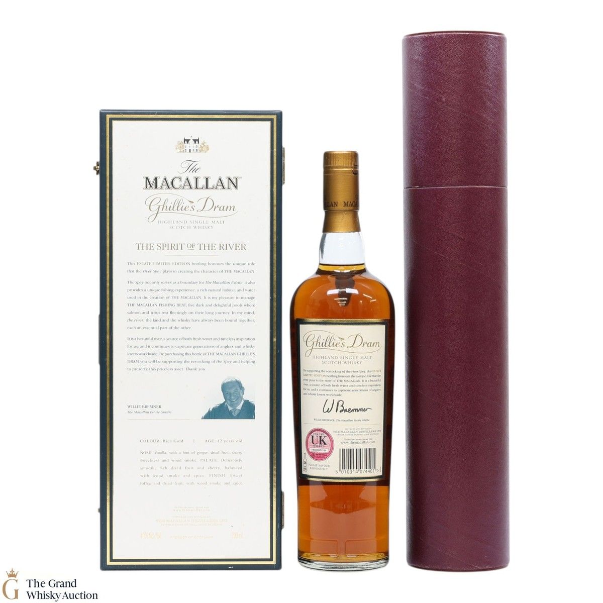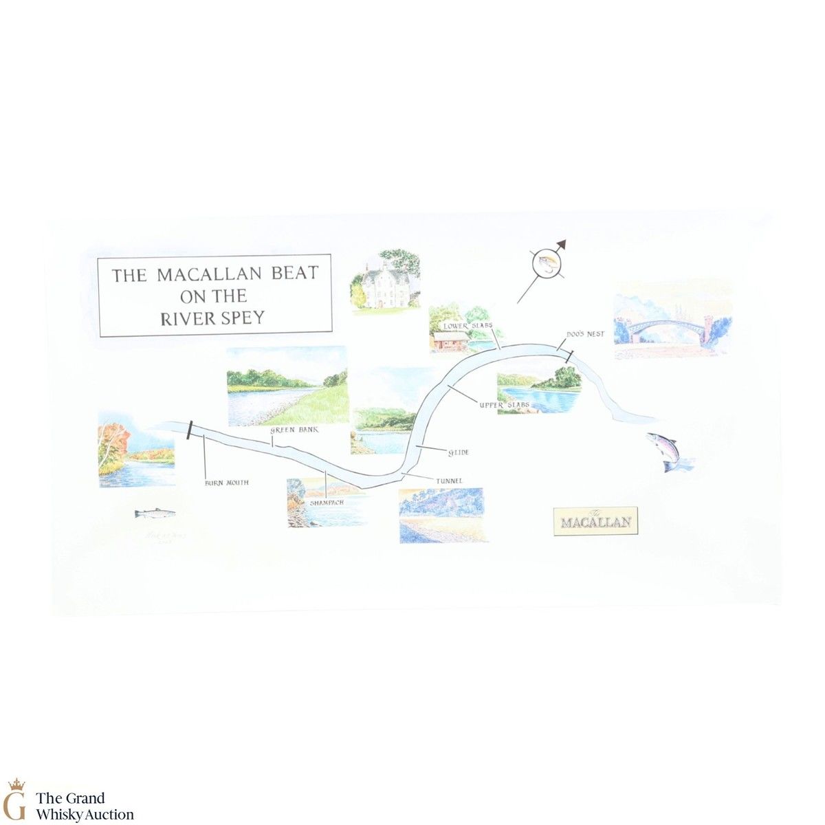 This unique lot is a limited edition Ghillie's Dram from Macallan. Dedicated to the Ghillie Willie Bremner, who operates in the River Spey. Included with this bottle of 12-Year-Old single malt is two fly fishing hooks and a watercolour of the River Spey.