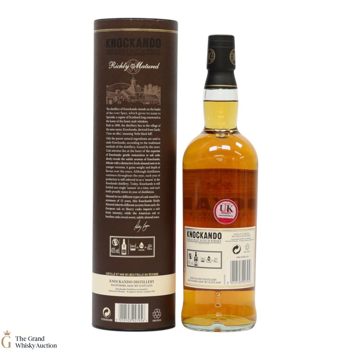 Knockando in Gaelic means 'little black hill'. The Knockando distillery is based in Speyside, Scotland. This single malt was distilled in 2003 before being left to mature for 15 years before being bottled at an ABV of 43%.