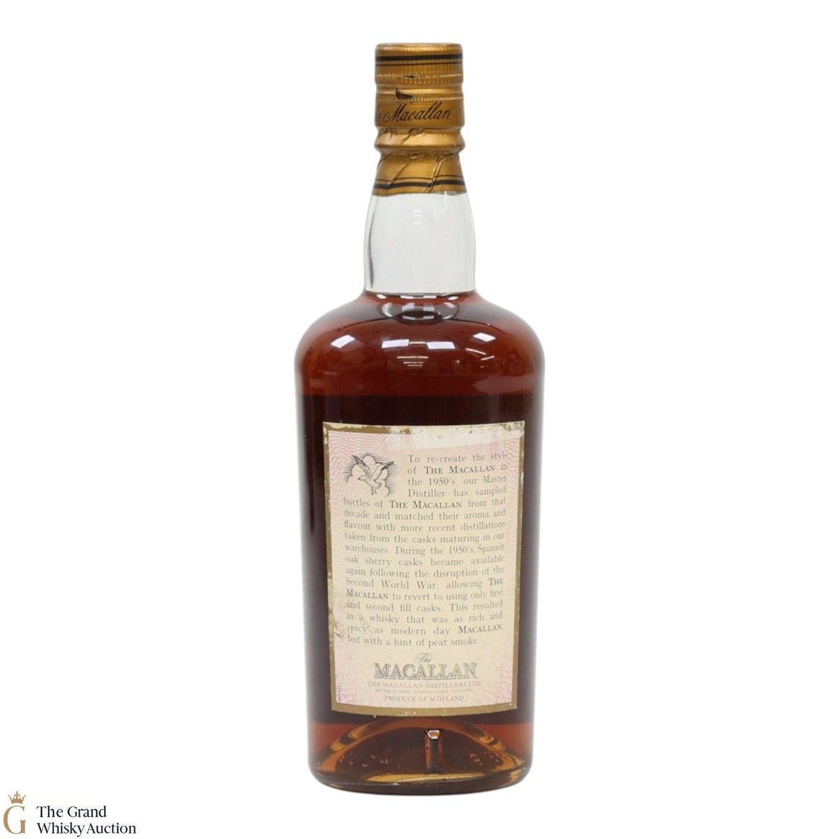 During the 1950s, Macallan whisky was as rich and spicy as modern-day Macallan, but with a hint of peat smoke. This was due to Spanish oak sherry casks becoming available again, following the disruption of the second world war. Macallan was ale to revert to using only first and second fill casks. 50cl, 40%.
