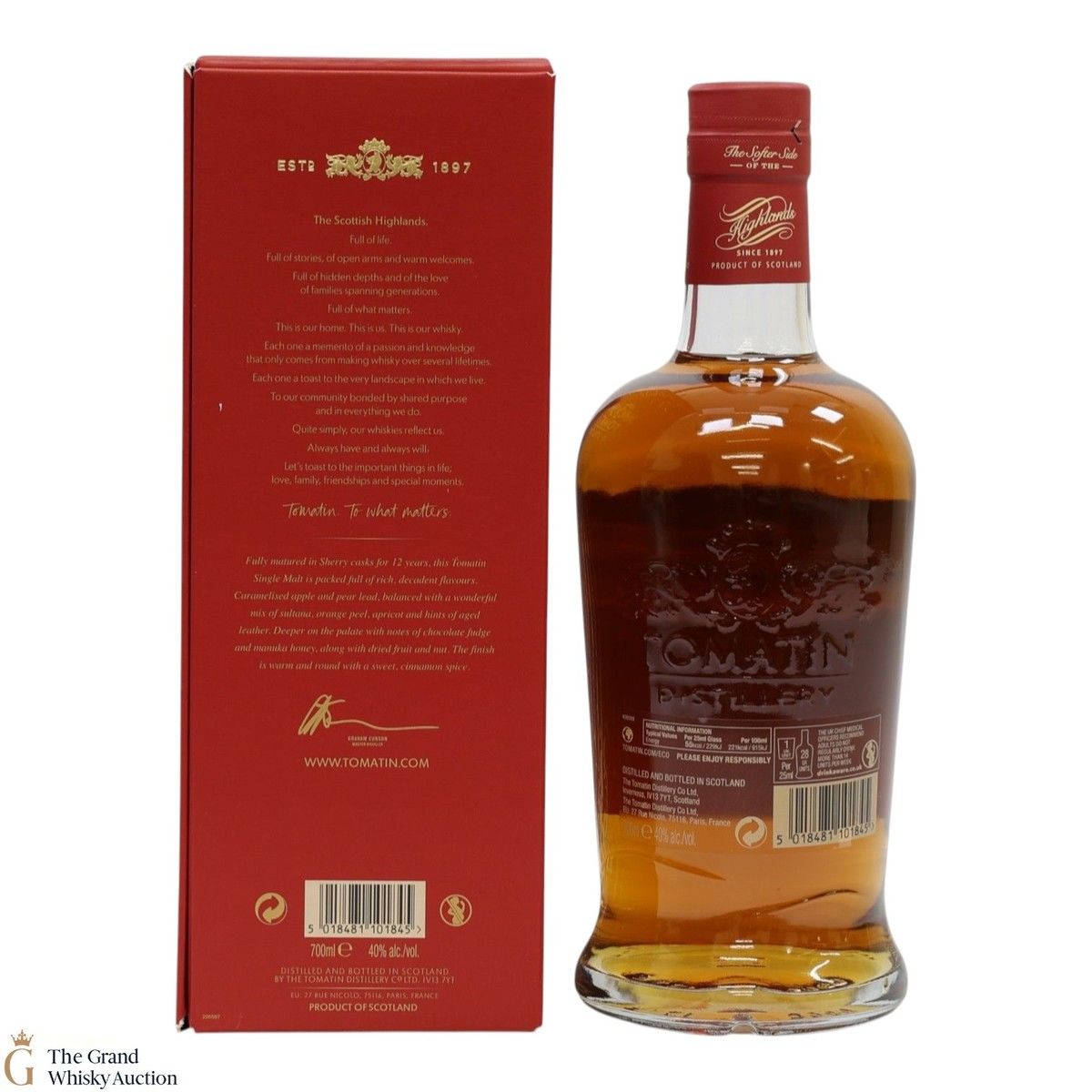 An addition to its core range in 2024, Tomatin's 12-year-old Sherry Cask builds upon the classic 12-year-old but is instead fully matured in sherry casks for 12 years. The bottle design boasts lots of scarlet and gold to pay homage to the flavours imparted by the sherry wood during the cask maturation process.