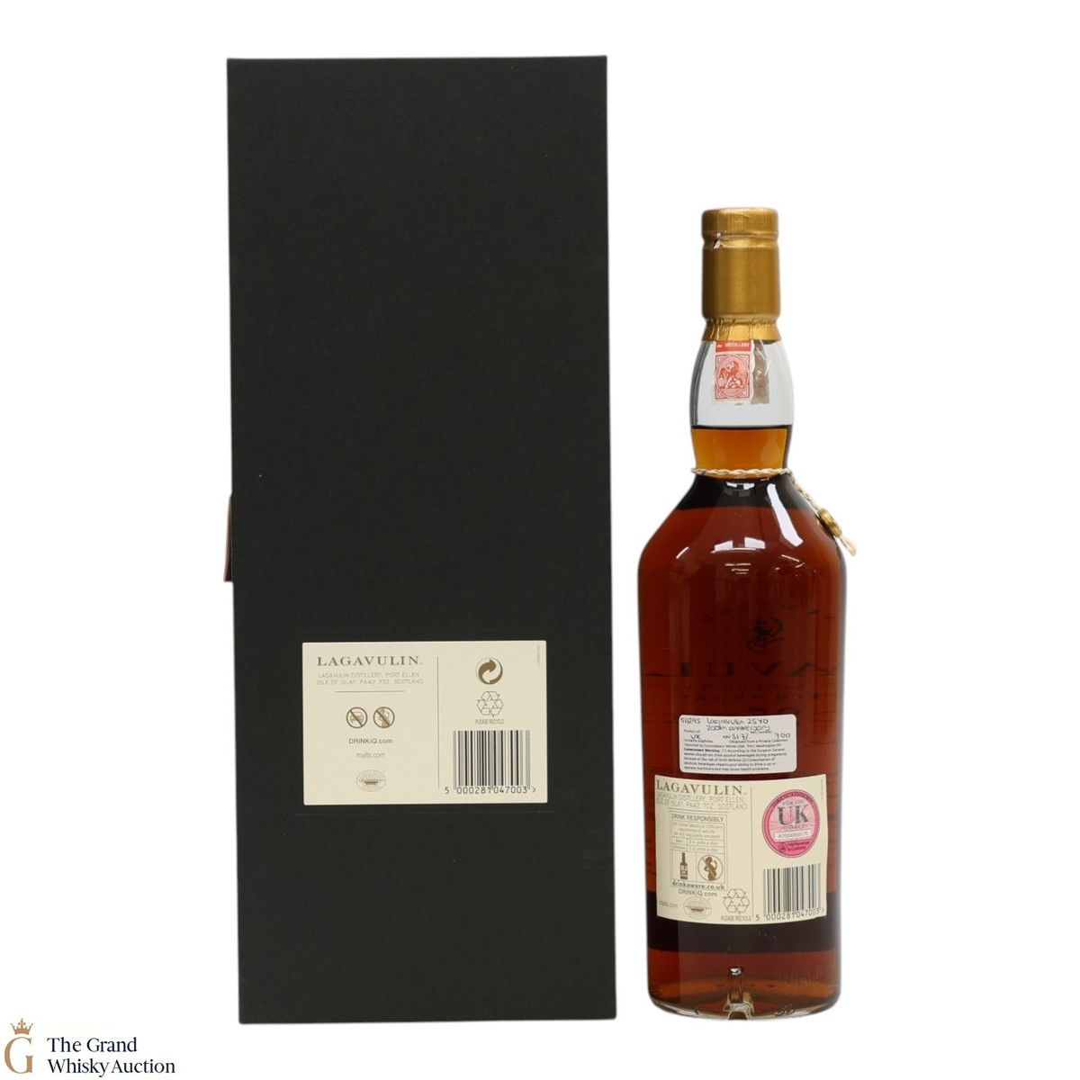 Due to the various ages of bottles and their seals, the condition of liquid is at the buyer's discretion and no claim can be lodged against failure/leakage in transit. Loss and breakage cover is available at 3% of the hammer price as standard. If the lot is not insured, no claim can be lodged against the courier or The Grand Whisky Auction for breakage or loss in transit.
