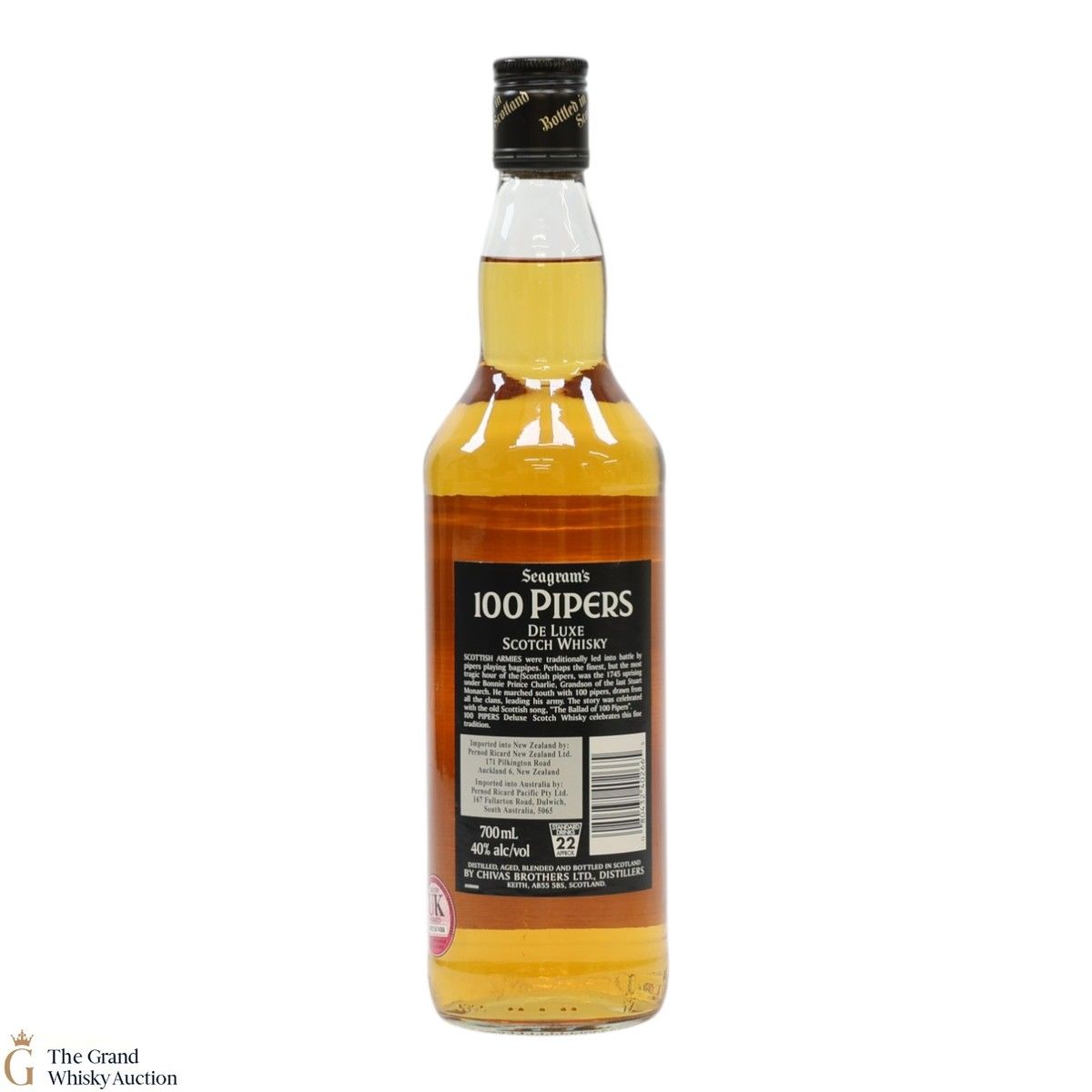 A 70cl bottling of Seagram's 100 Pipers Deluxe blended Scotch whisky, which was named after the 100 pipers that followed Bonnie Prince Charlie into battle.