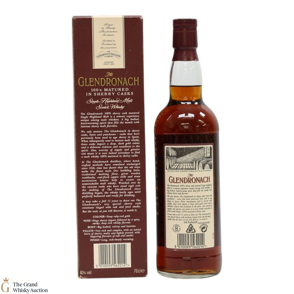 A 70cl bottle of Glendronach 15 Year Old from the 1990s. Matured sherry casks. At the time of release, this expression was a flagship whisky for Glendronach. It has since been followed by the new and very popular 15-Year-Old Revival.