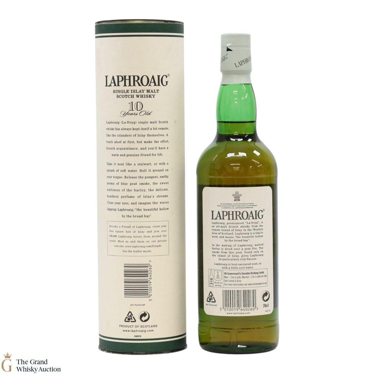 A 70cl of the medicinal 10 year old from Islay's bestselling distillery, Laphroaig. In making Laphroaig, malted barley is dried over a peat fire. The smoke from this peat, found only on Islay, gives Laphroaig its particularly rich flavour.